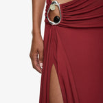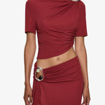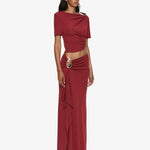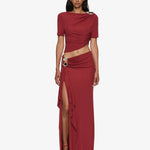 The Orica Cascade Jersey Skirt balances fluid drape with sculptural detail. A curved crystal-set ring gathers the hip, cascading into a softly flared silhouette.