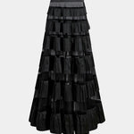 Tiered mesh skirt in alternating sheer and opaque panels that create a clean, vertical rhythm through the full length silhouette. The mesh offers a light transparency while the structured lower panel lends a subtle lift, lending quiet, floaty movement.