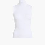 A sleeveless, stand-collar top in finely ribbed viscose selected for its sleek, smooth character and high shine, which imparts an almost iridescent quality.