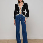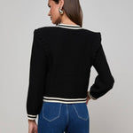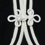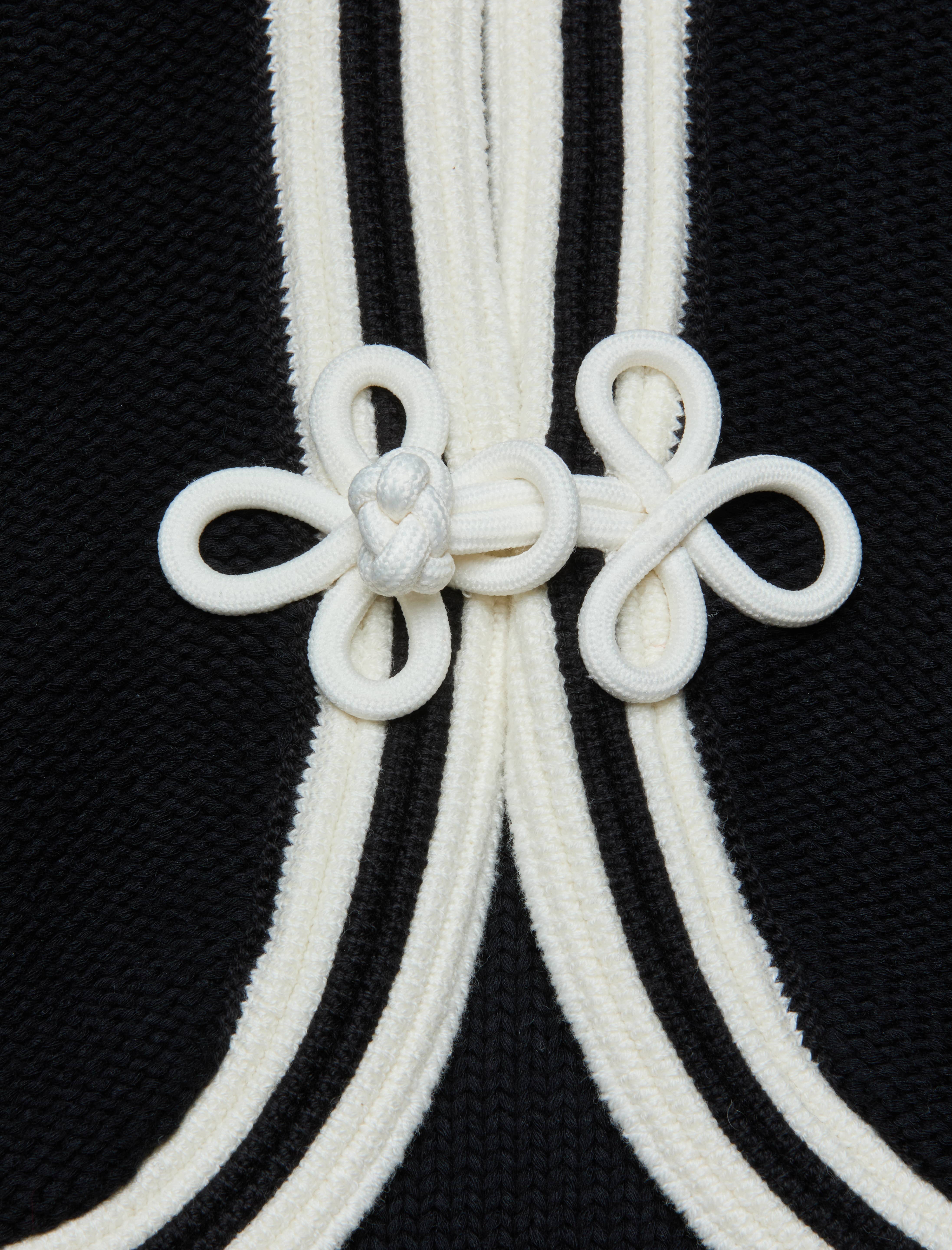 Modern and striking, the Kaito reimagines the quintessential cardigan with frog knot closures and subtle blouson sleeves. Now in black with contrasting white trim.