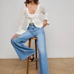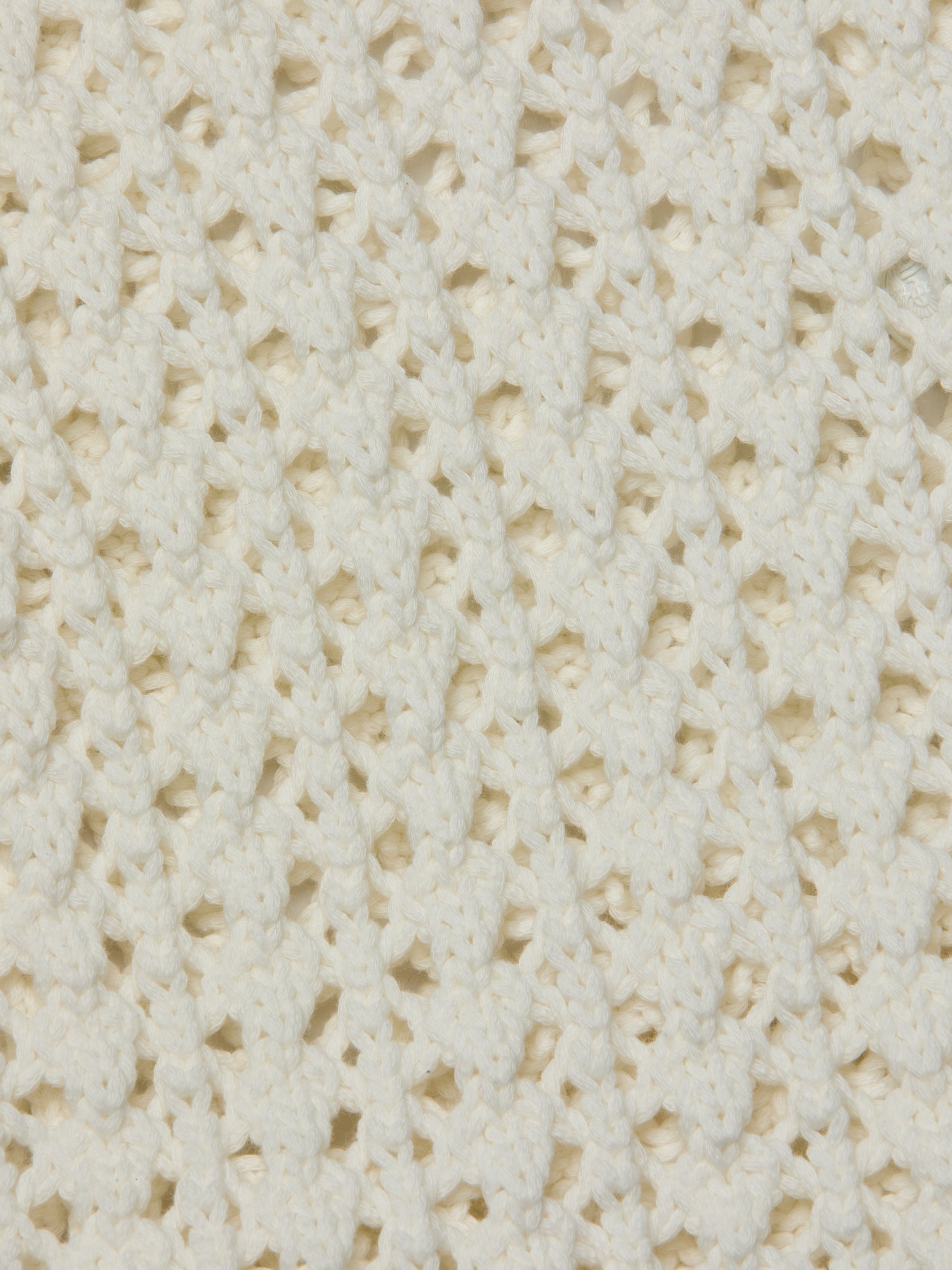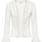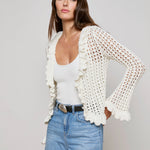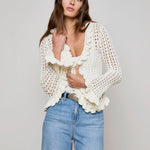 Summer, in a knit. Feminine and airy, the Solaris is an open-stitch crochet cardigan finished with delicate ruffled trims. Now in ivory, she’s the lightweight layer you’ll want to wear all season. Throw it on over a bikini or pair it with a camisole and jean shorts.