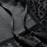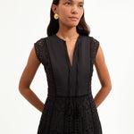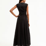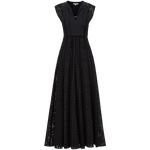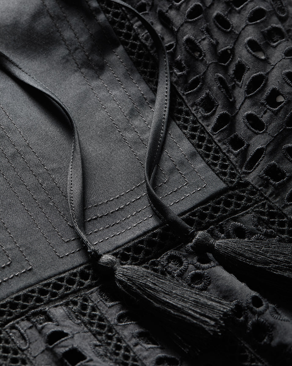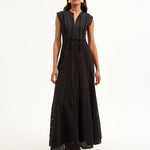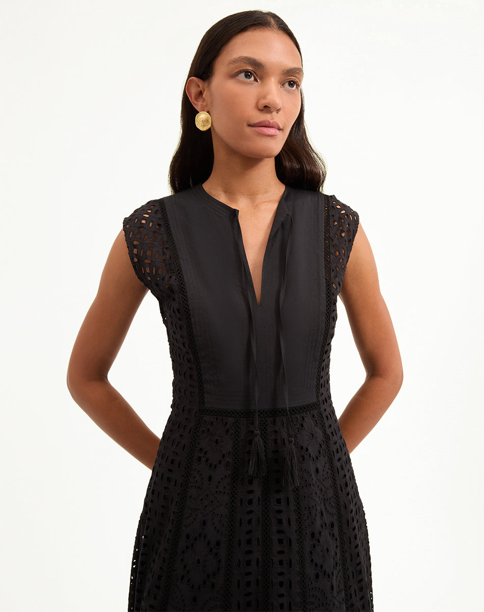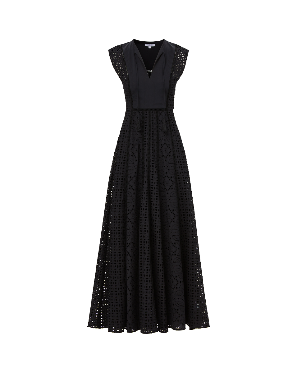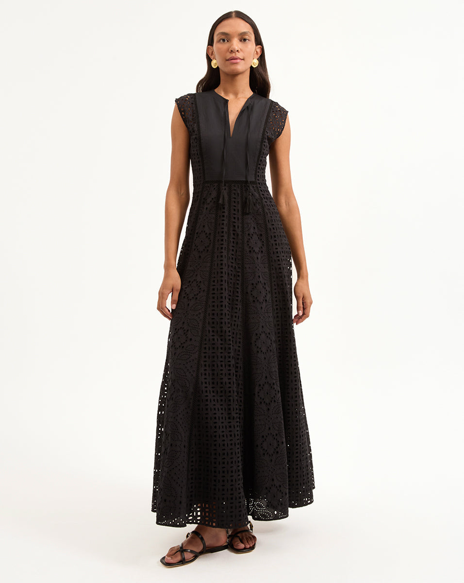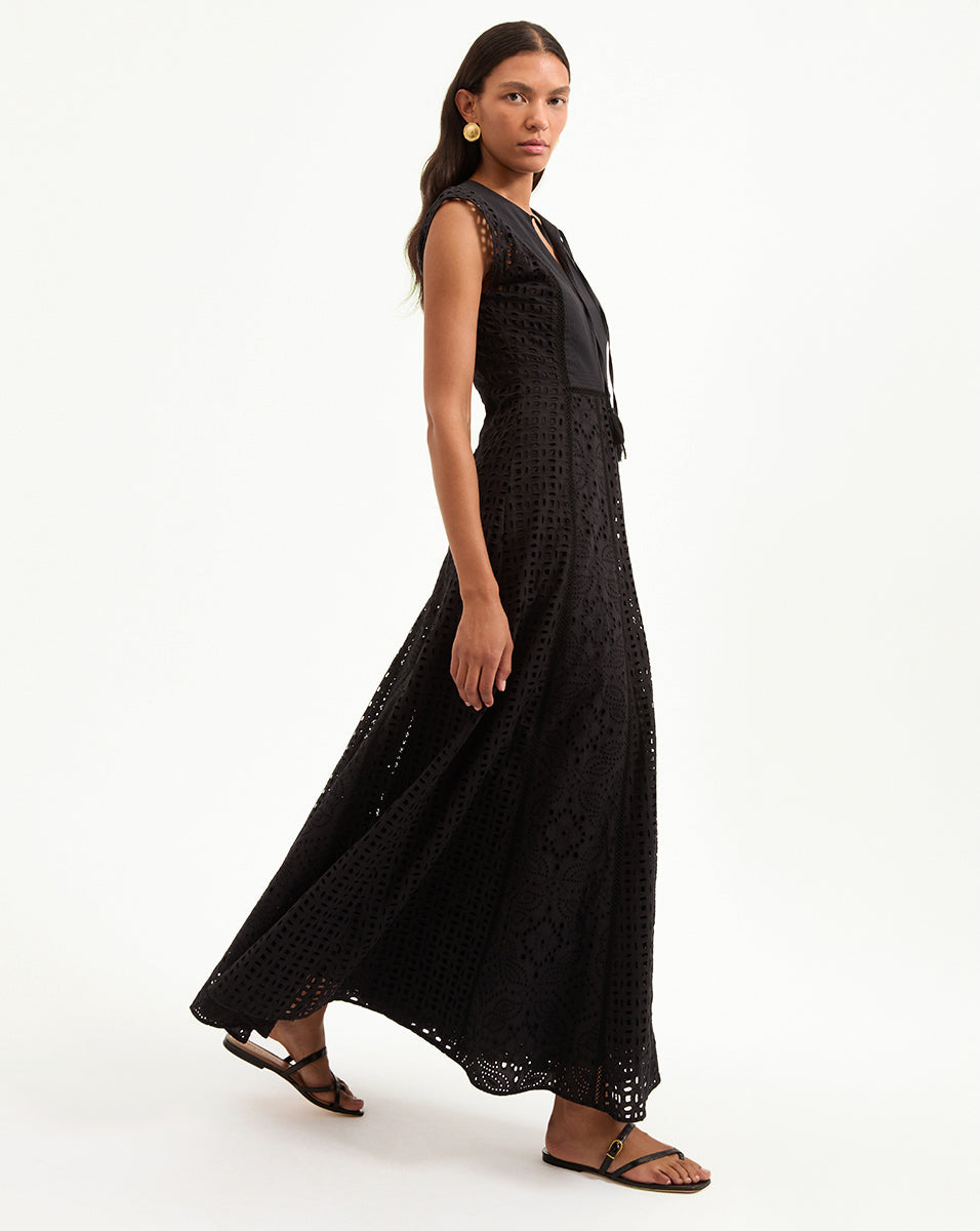 Expertly tailored from lightweight cotton, the black Alina sleeveless dress is defined by an elegant, sweeping maxi silhouette and a charming allover eyelet design. A split-v neck with tassels complete the look. Sophisticated yet effortless—this is how you do best-dressed guest for balmy summer days. Style with chic flats or strappy slingbacks.