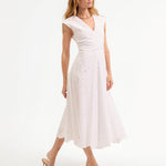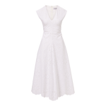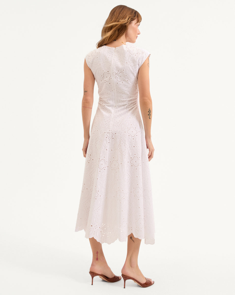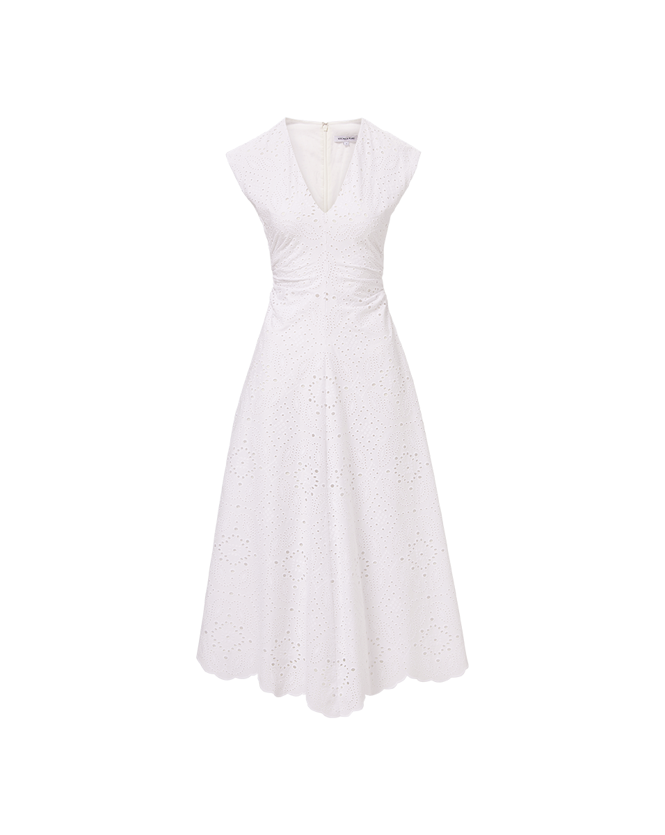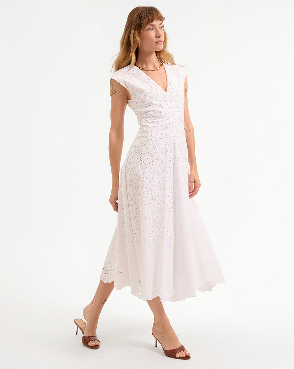 Expertly tailored from lightweight cotton, the white Aven midi dress is defined by a charming allover eyelet design. A chic summer-ready dress, it features cap sleeves, a V neck, and slight ruching at the sides for waist definition. An effortless summer go-to, this can easily be dressed up or down—add flats for day, heels, and jewelry at night.