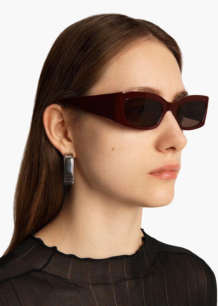 In collaboration with Oliver Peoples, the vision of KHAITE extends to eyewear. Handcrafted in Italy, these sunglasses embody robust precision in a full-bodied statement silhouette with a shallow lens shape. Tipped by alternating logos, the boldly formed temples feature shooting corewire inspired by the hardware of KHAITE handbags. Each pair includes a signature lipstick red case and a drawstring pouch that doubles as a lens cloth.
