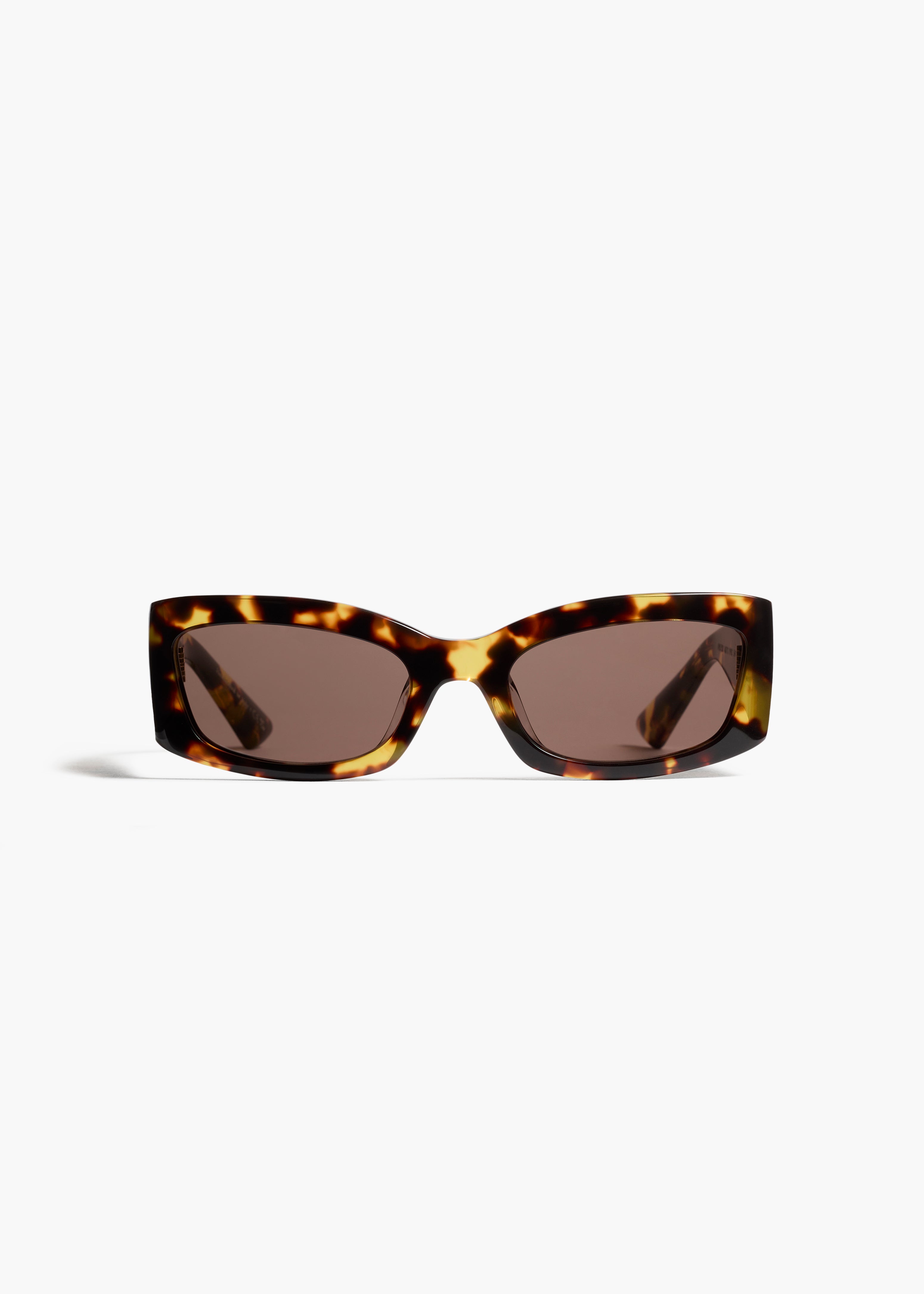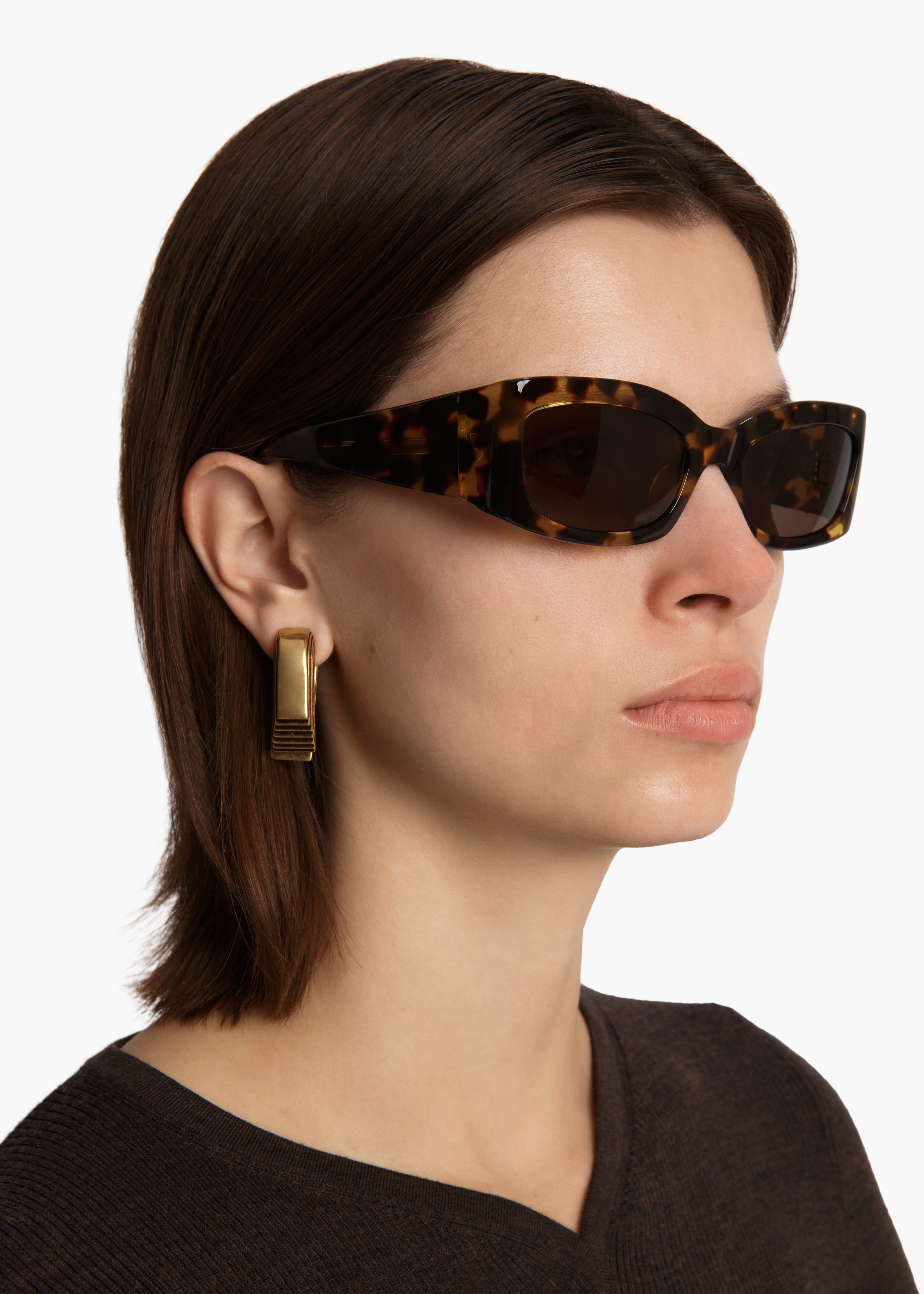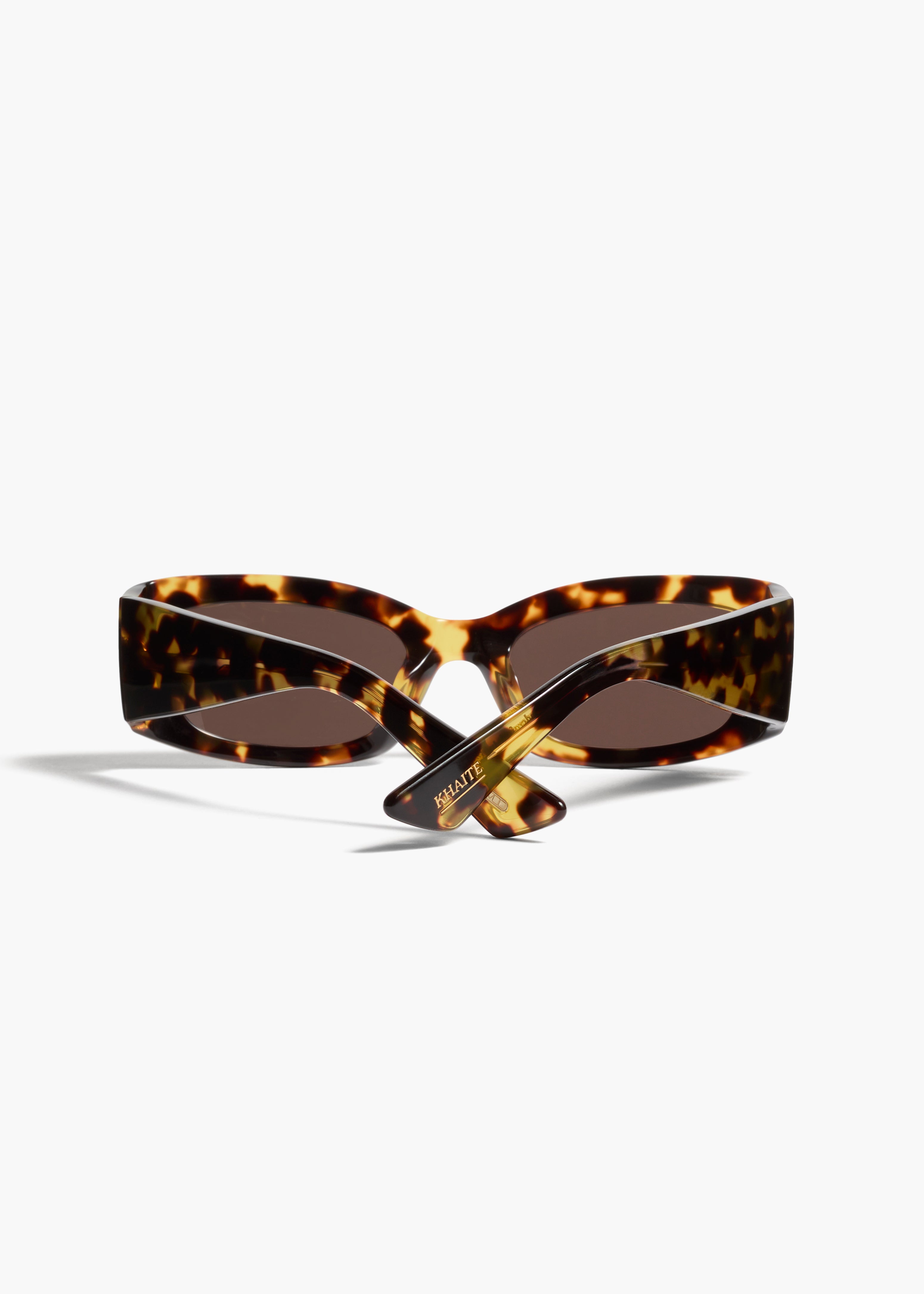In collaboration with Oliver Peoples, the vision of KHAITE extends to eyewear. Handcrafted in Italy, these sunglasses embody robust precision in a full-bodied statement silhouette with a shallow lens shape. Tipped by alternating logos, the boldly formed temples feature shooting corewire inspired by the hardware of KHAITE handbags. Each pair includes a signature lipstick red case and a drawstring pouch that doubles as a lens cloth.