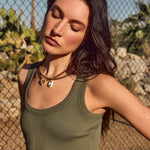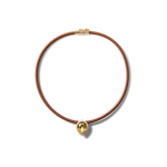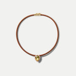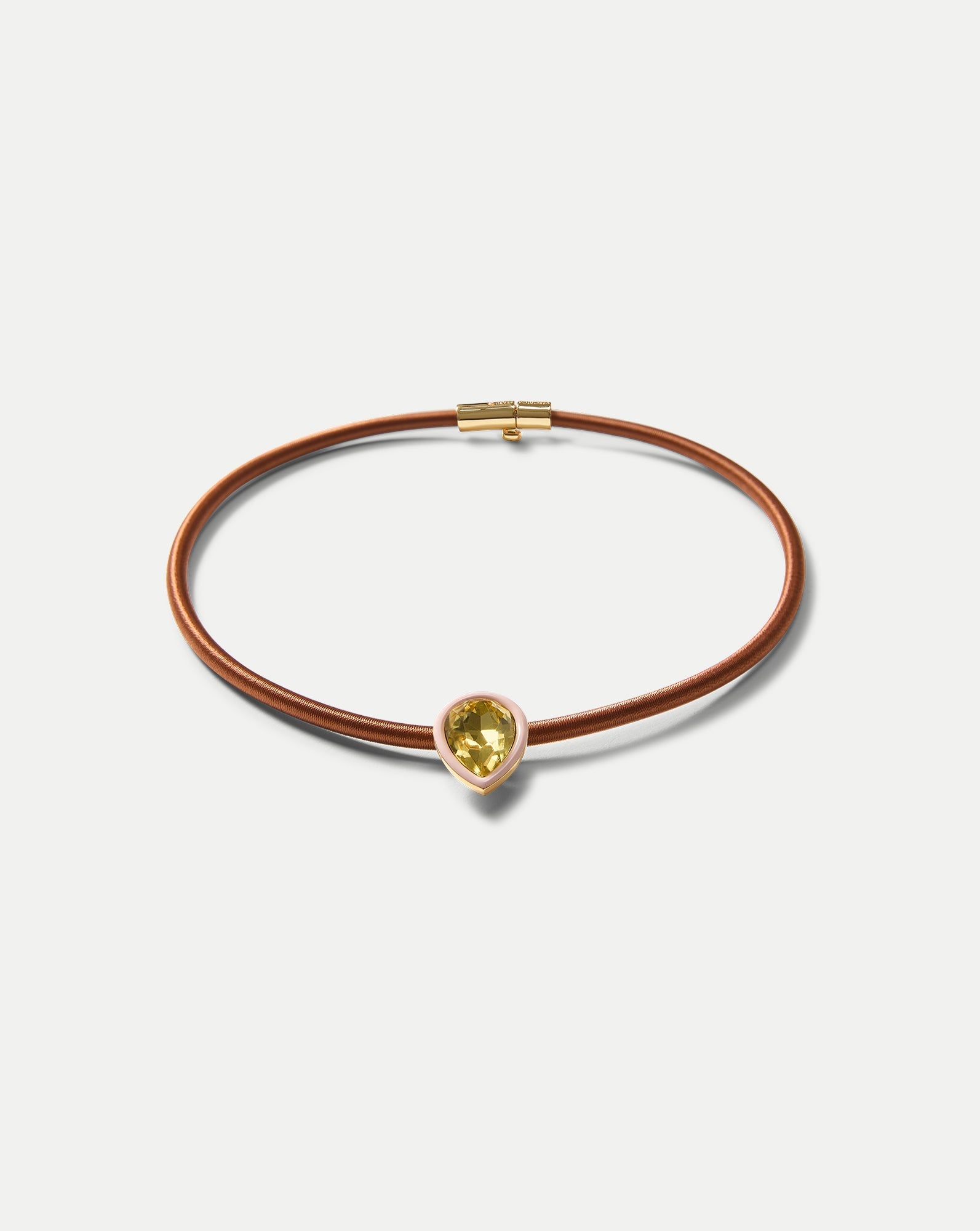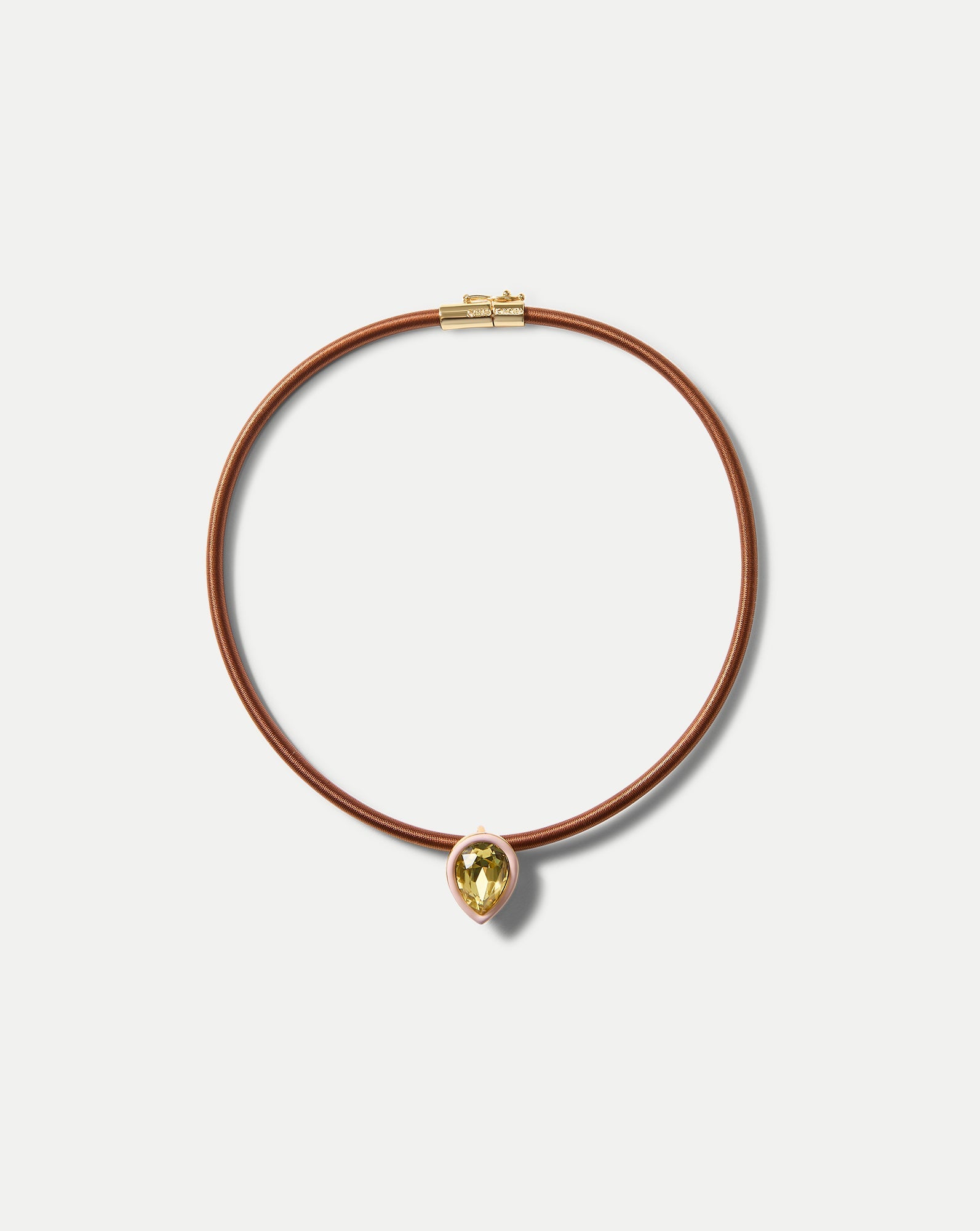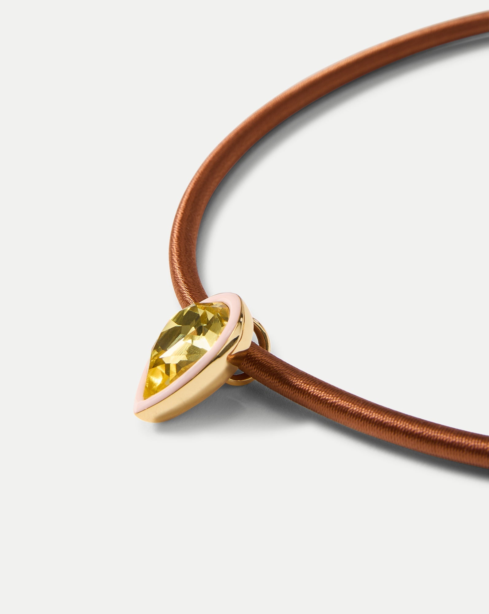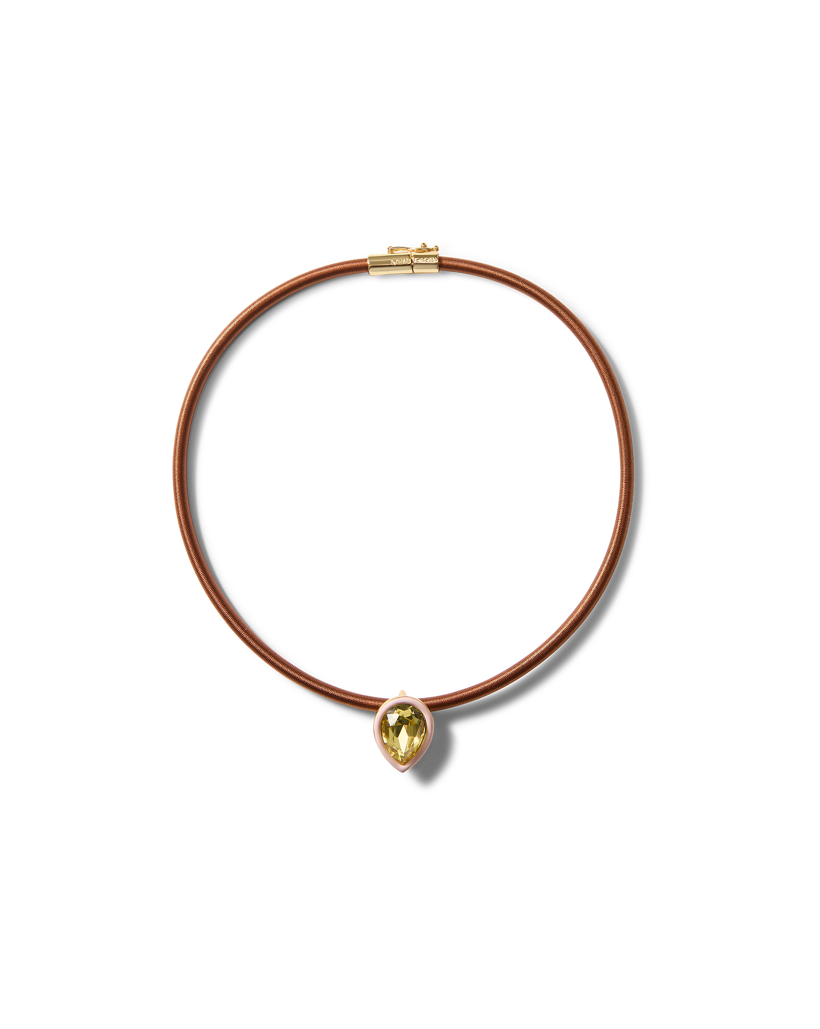 A chic summer necklace for the beach and beyond. Falling just below the collarbone, it’s crafted from rounded brown cord and features a green glass teardrop-shaped pendant with pink enamel and 12-karat gold-plated brass accents—fastening securely with a barrel clasp, for ease. Equal parts polished and cool, it boasts a wear-everywhere versatility—style with a bikini, a breezy button-down, or a slinky top.