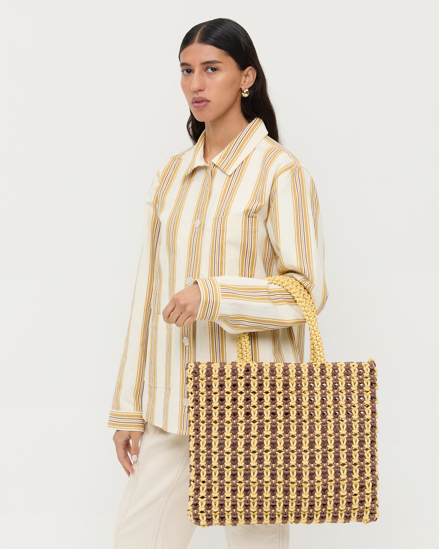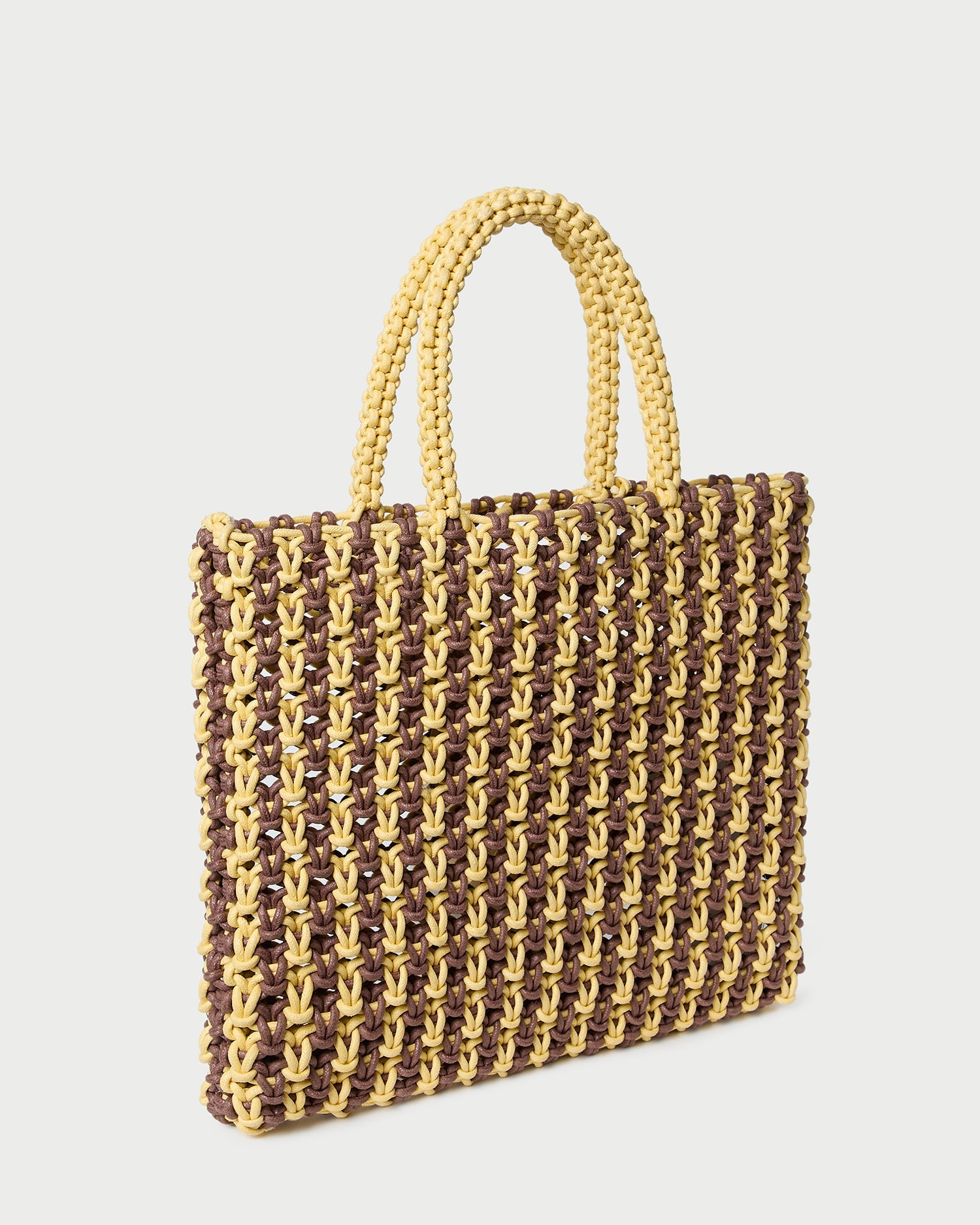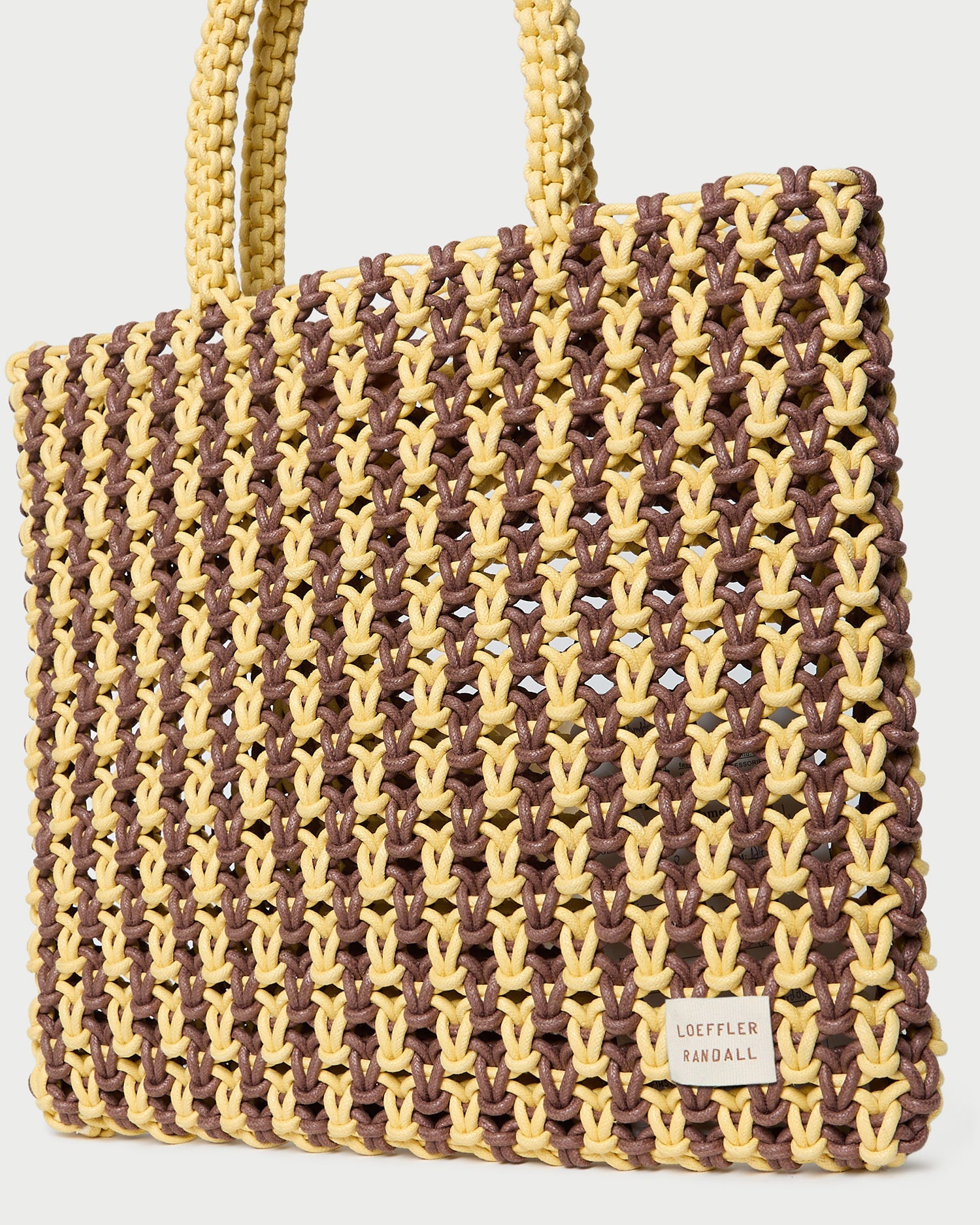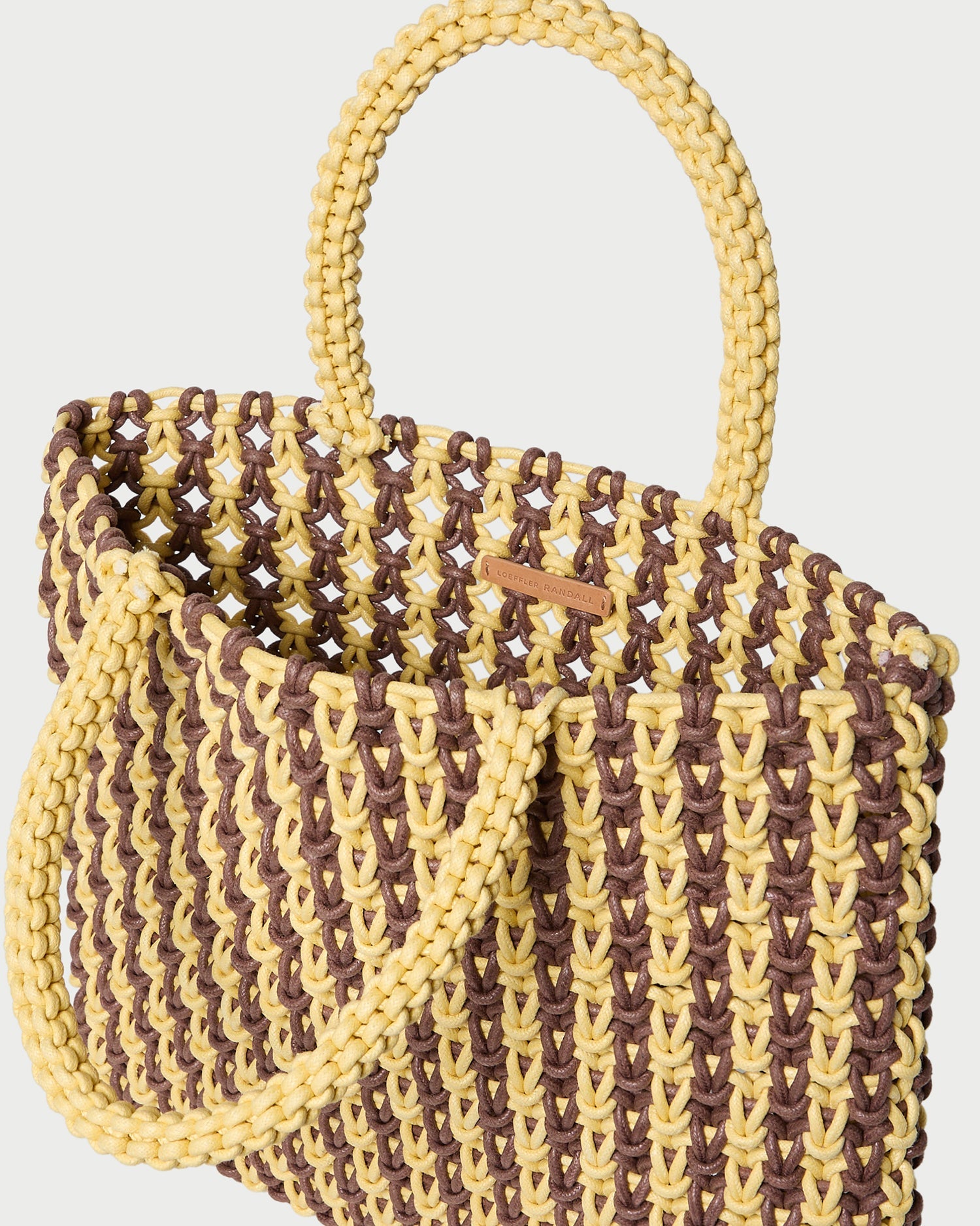 Knotted tote in brown and butter cording. Features shoulder straps and a white cotton patch logo. Unlined.