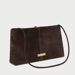 Clutch in brown gathered split suede. Features a multi-ring gold hardware accent, magnetic closure, lined interior, and a removable brown suede strap.