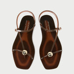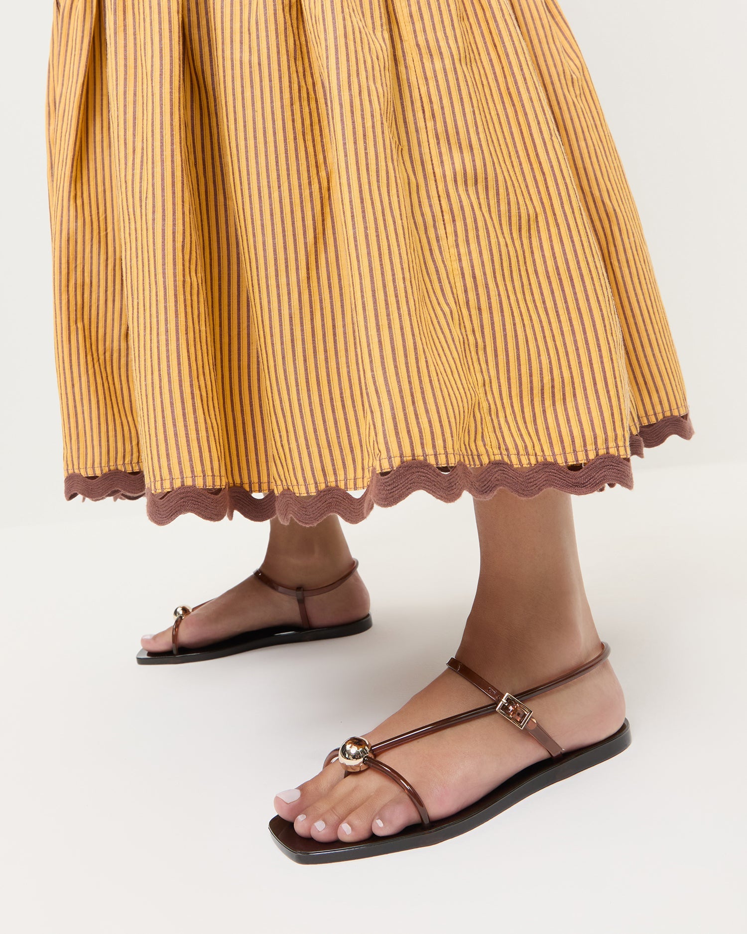 Flat sandal in brown jelly material. Features gold ball detail, a plank footbed, an open toe, and a delicate strap design with buckle closure. Based on the silhouette of our best-selling Lara sandal.