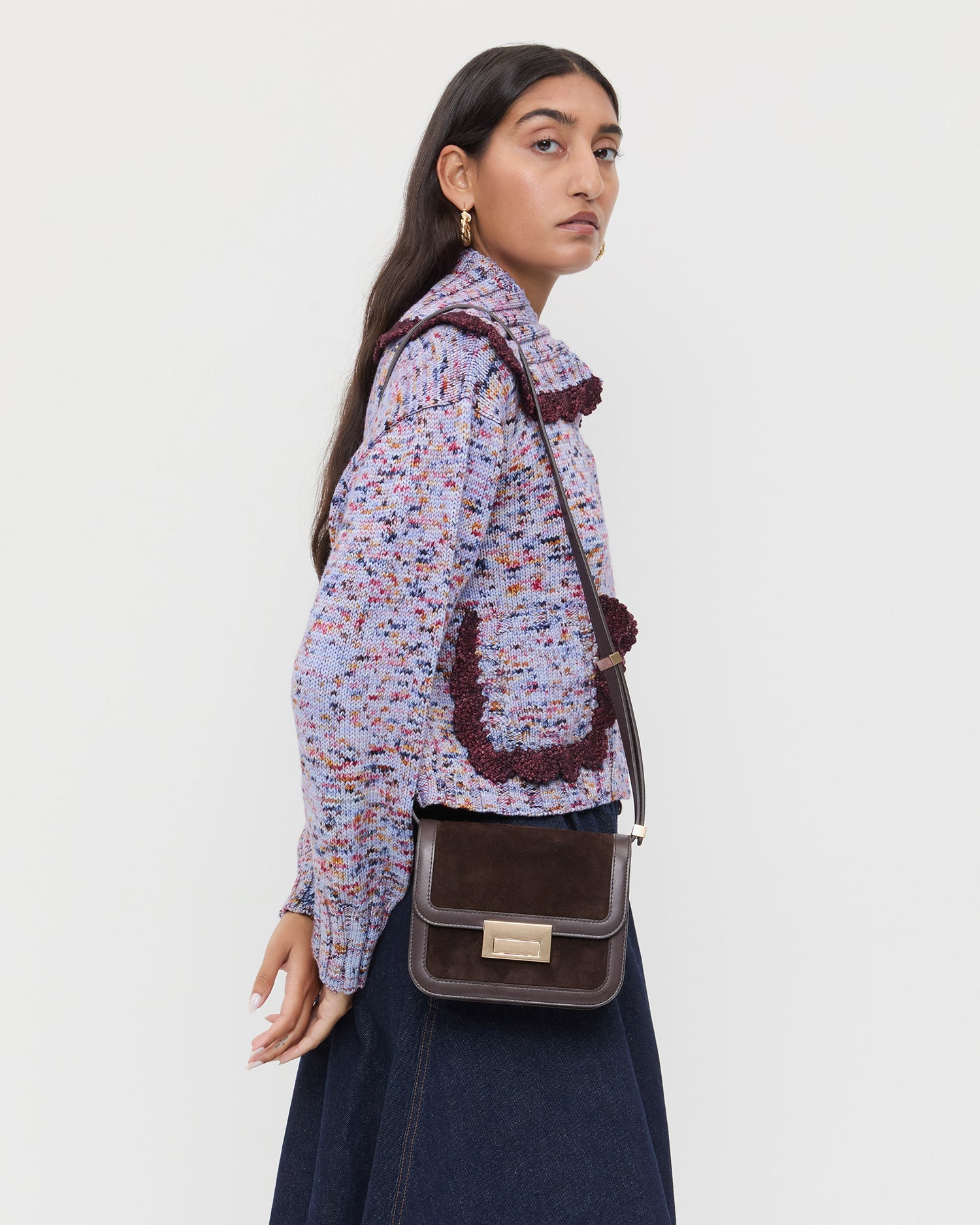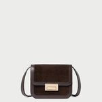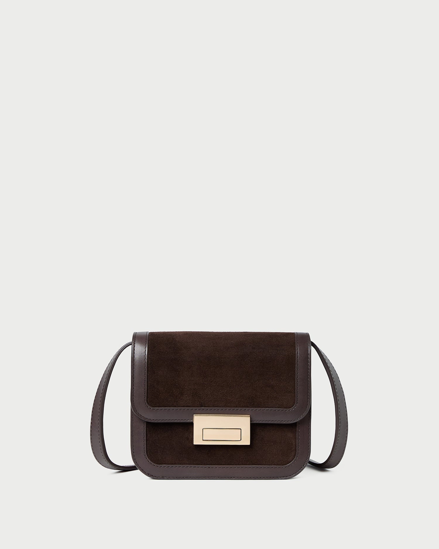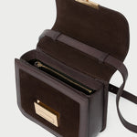 Crossbody in brown suede and vachetta leather. Features an adjustable strap, flap design, push lock closure, full lining, and gold stamped logo.