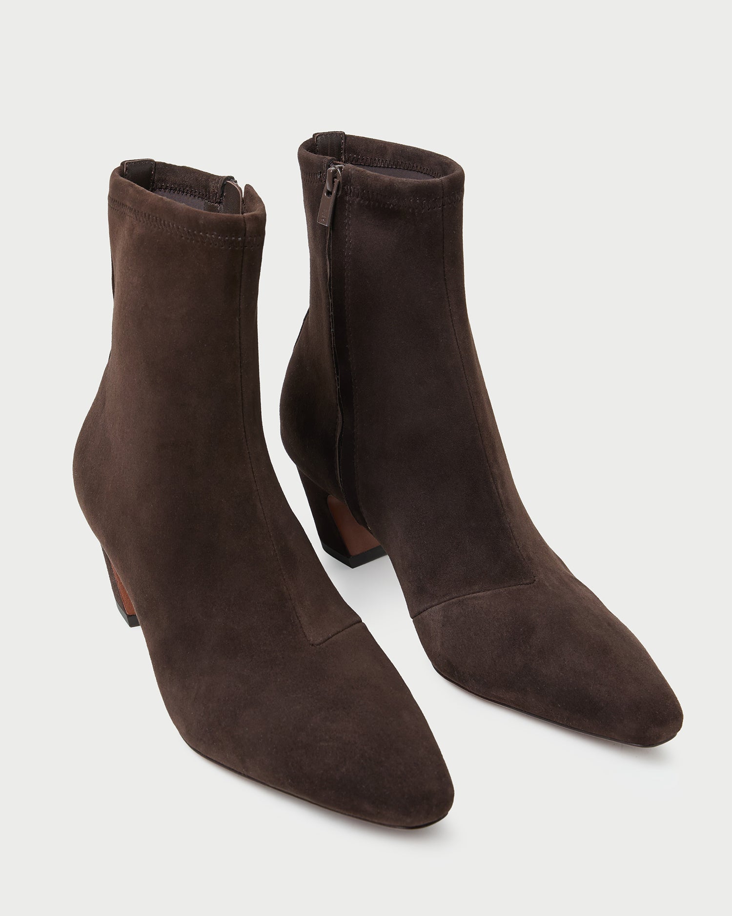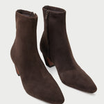 Mid-heel ankle bootie in brown stretch suede. Inspired by our best-selling Cleo boot, they feature a pointed toe, kicked heel, and a padded footbed with gold stamped logo. 2-inch heel.