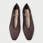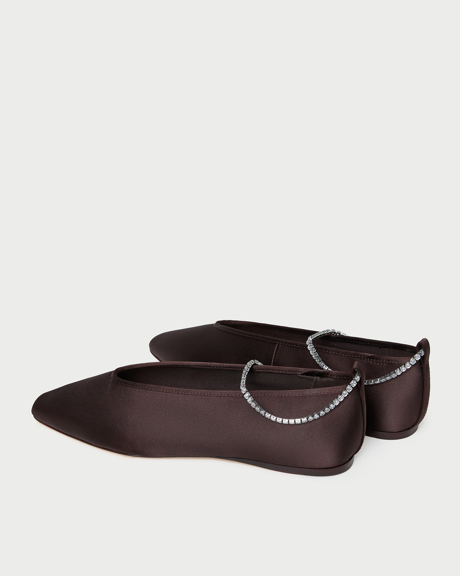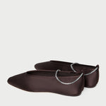 Square toe ballet flat in dark brown satin. Features a removable crystal ankle strap and padded footbed with gold stamped logo. Slips on.