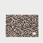 Quilted laptop sleeve in brushed leopard nylon. Features an exterior zip pocket, cotton logo patch, and Velcro flap closure.