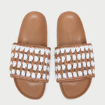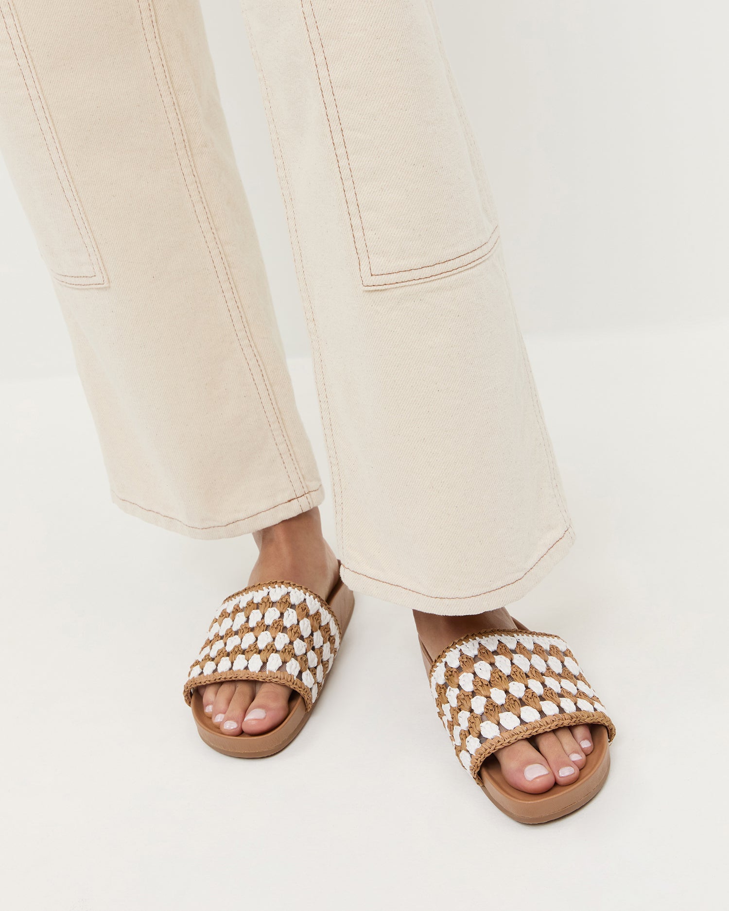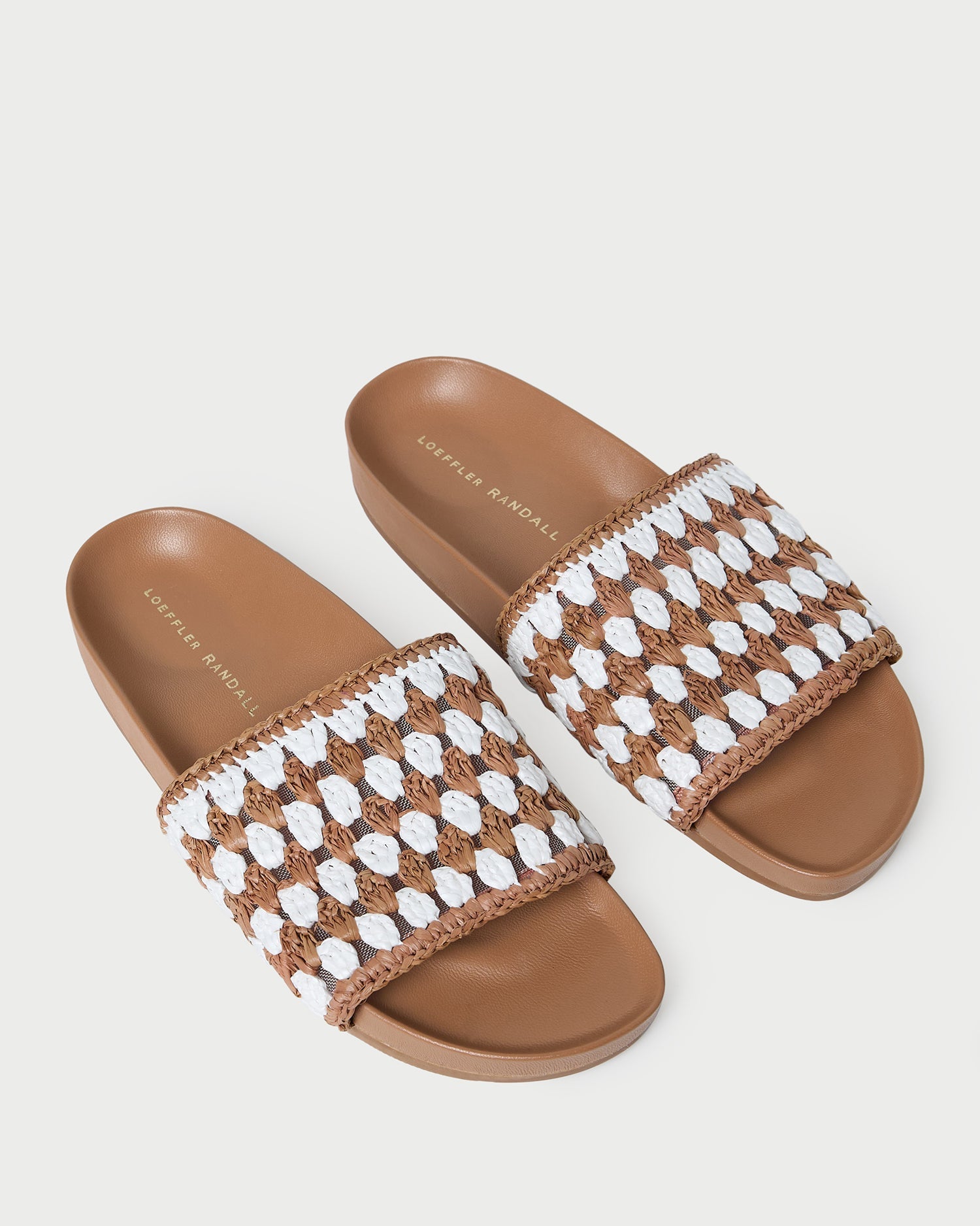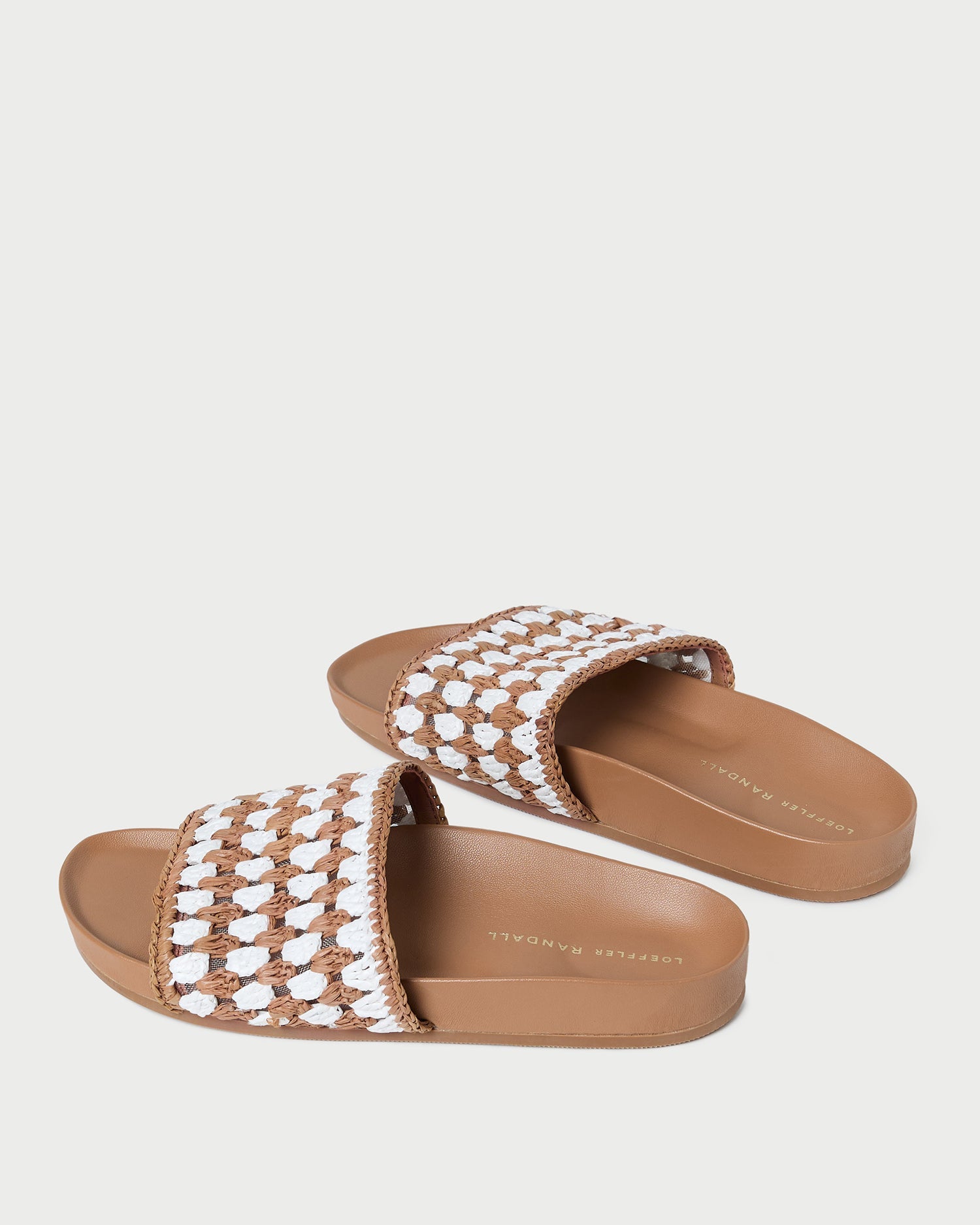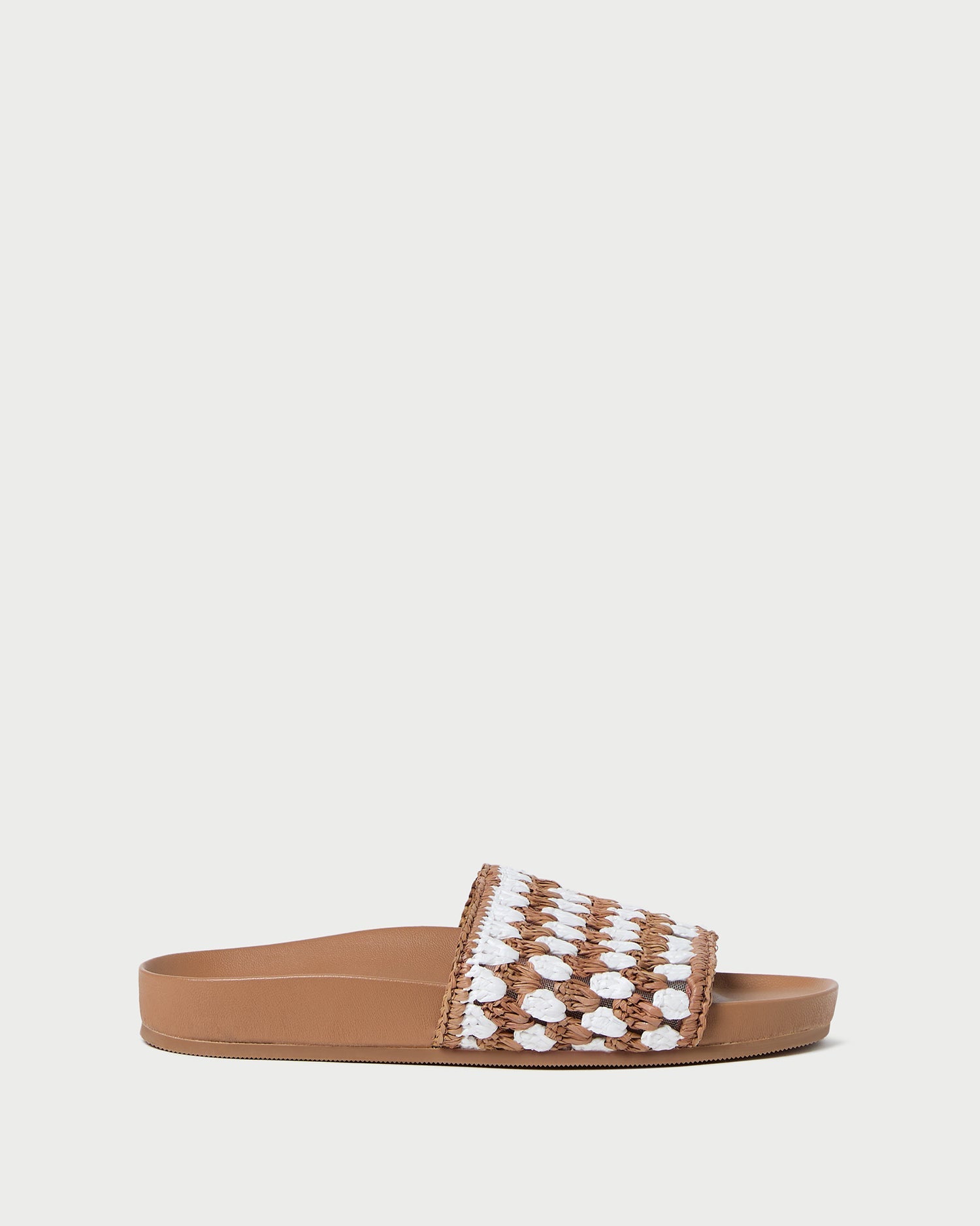 Flat slide sandal in brown and white crocheted straw. Features an open toe, a padded leather footbed with a gold-stamped logo, and a tonal leather sole. Slips on.