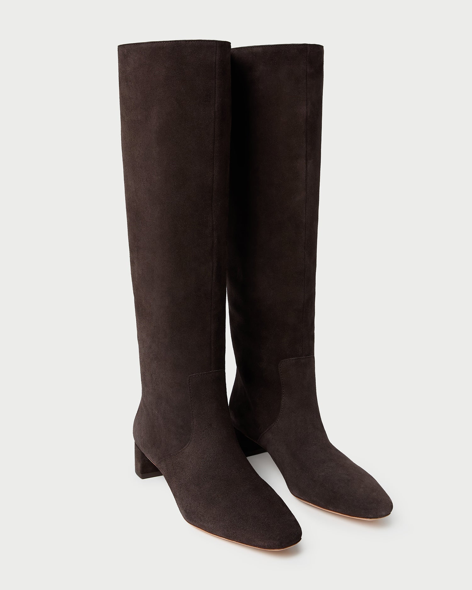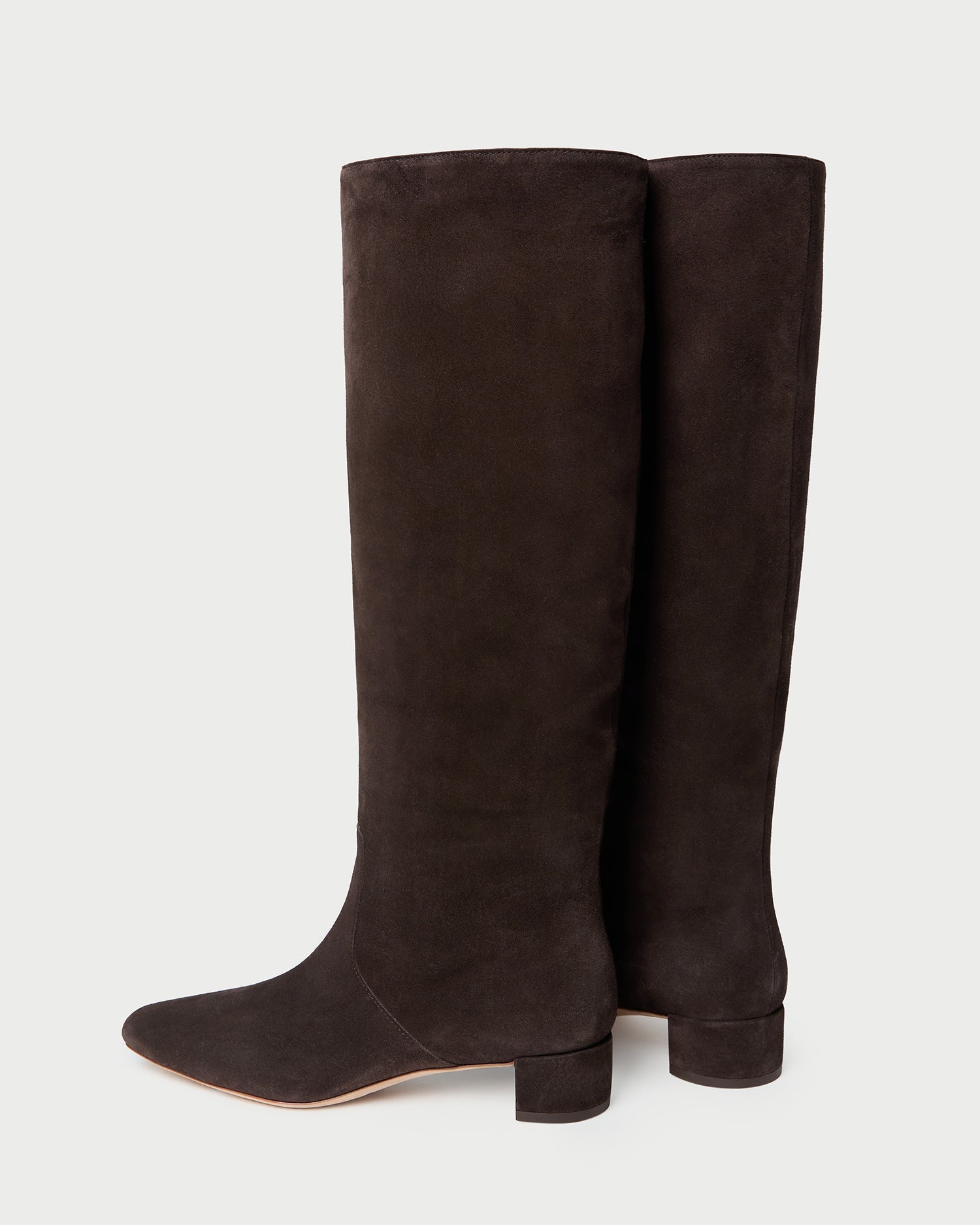 Tall mid-heeled boot in brown suede. Features a padded footbed with gold stamped logo, an elongated toe, and pulls on. 1.5-inch heel.