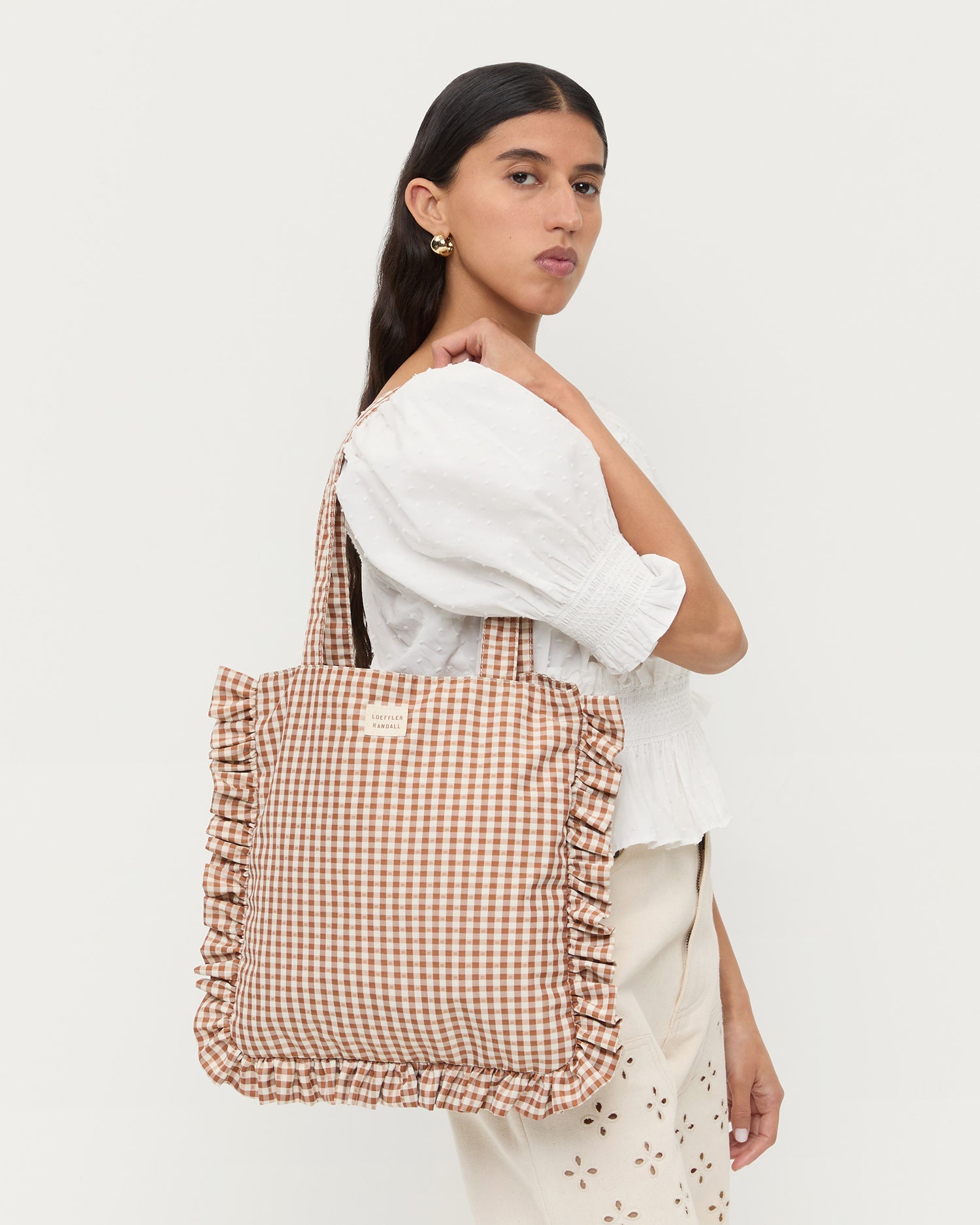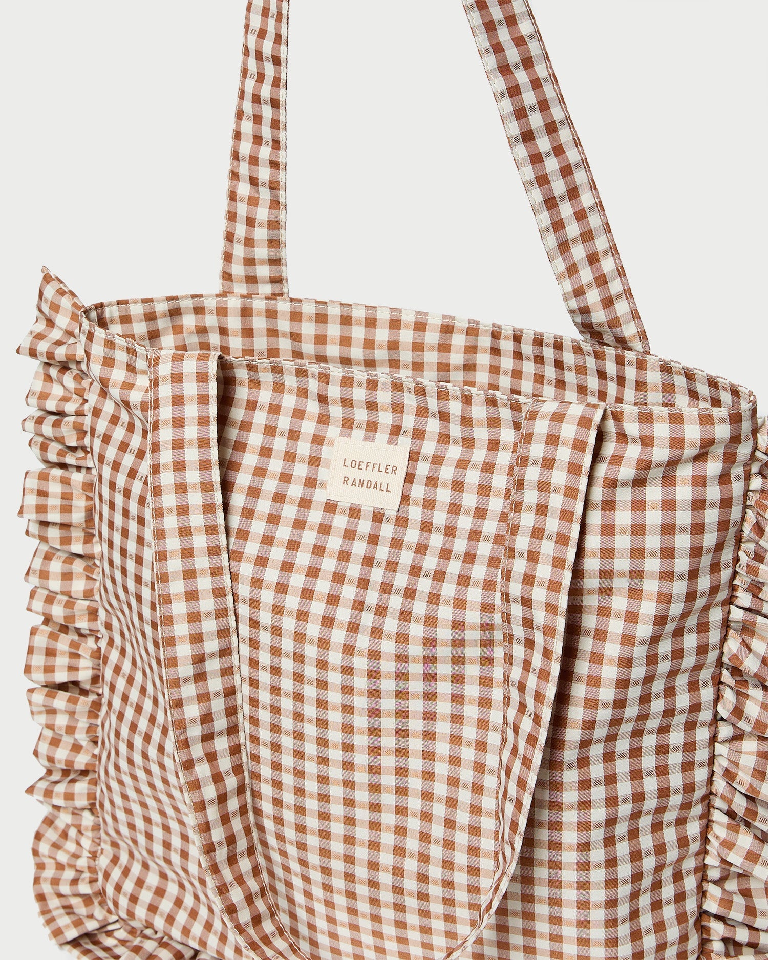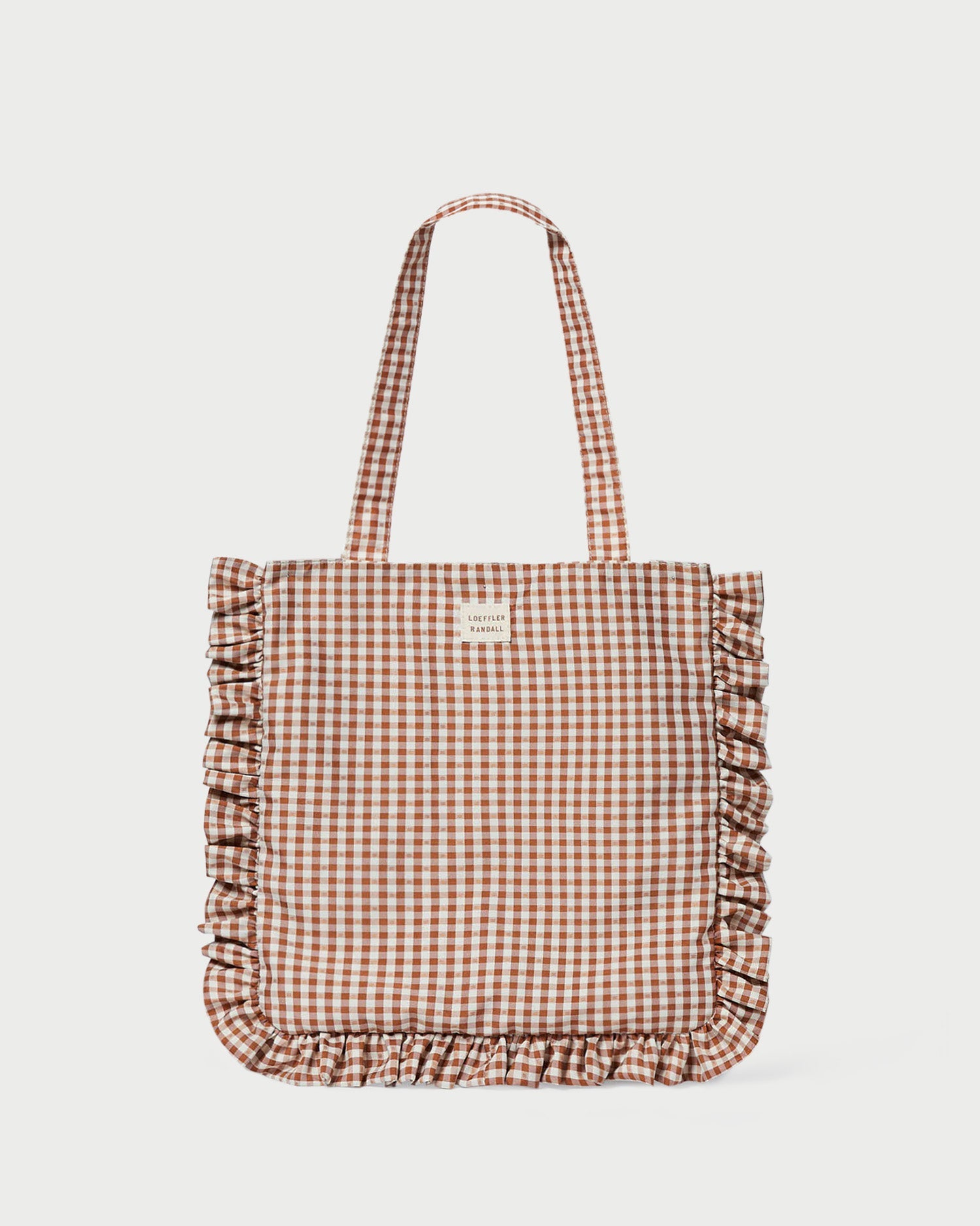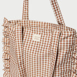 Tote in brown gingham with ruffle trim. Features a cotton logo label.