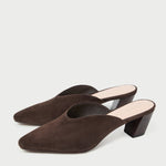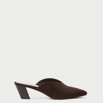 Mid-heel mule in brown suede. Features a kicked heel, pointed toe, and padded footbed with gold stamped logo. 2-inch heel.