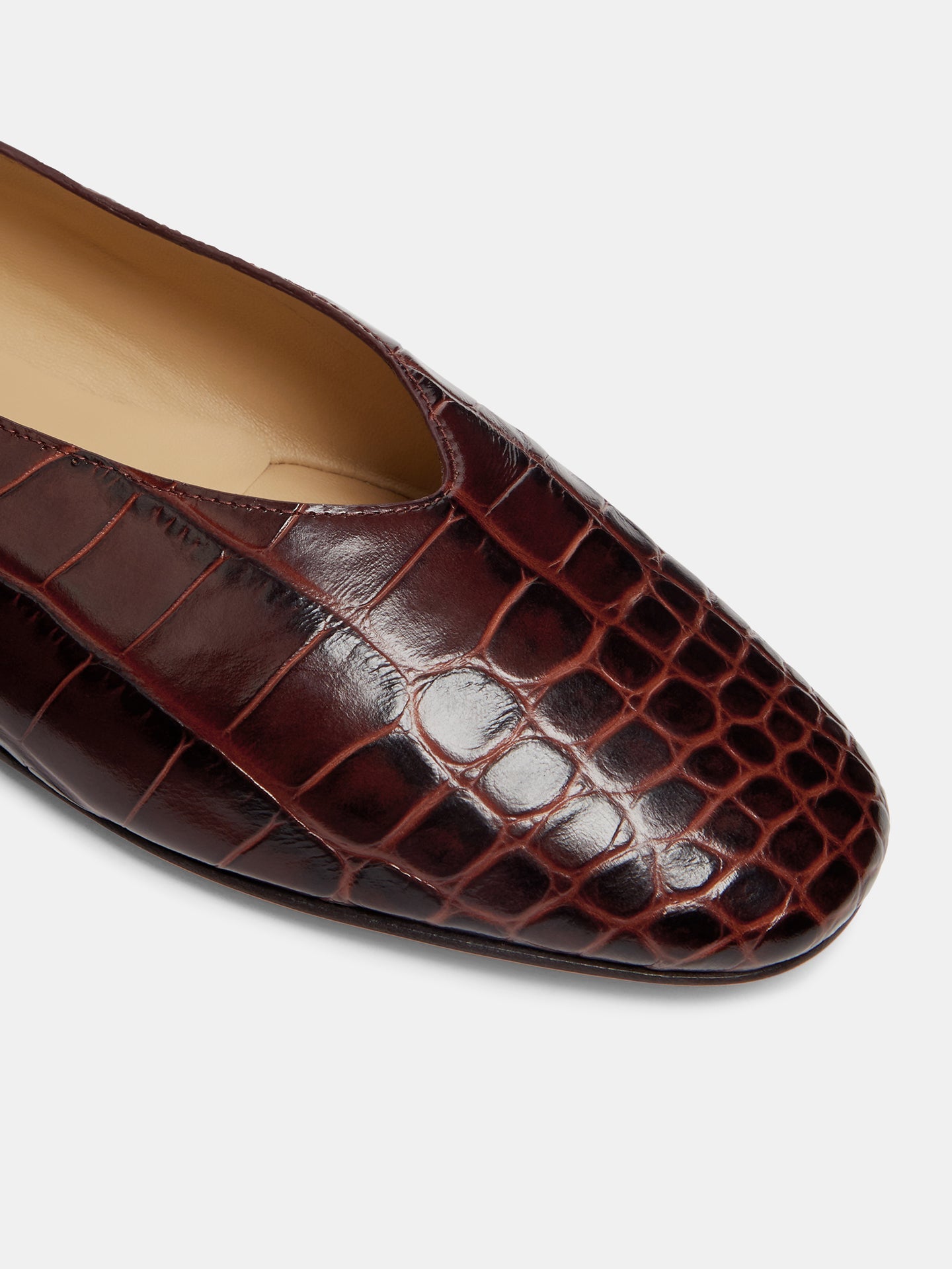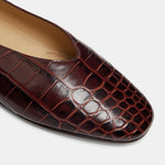 Regency Slipper, handcrafted in coco brown croc embossed leather, in a new sacchetto construction, with a soft cushioned calf leather insole and leather piping. 8mm heel. Made in Italy.