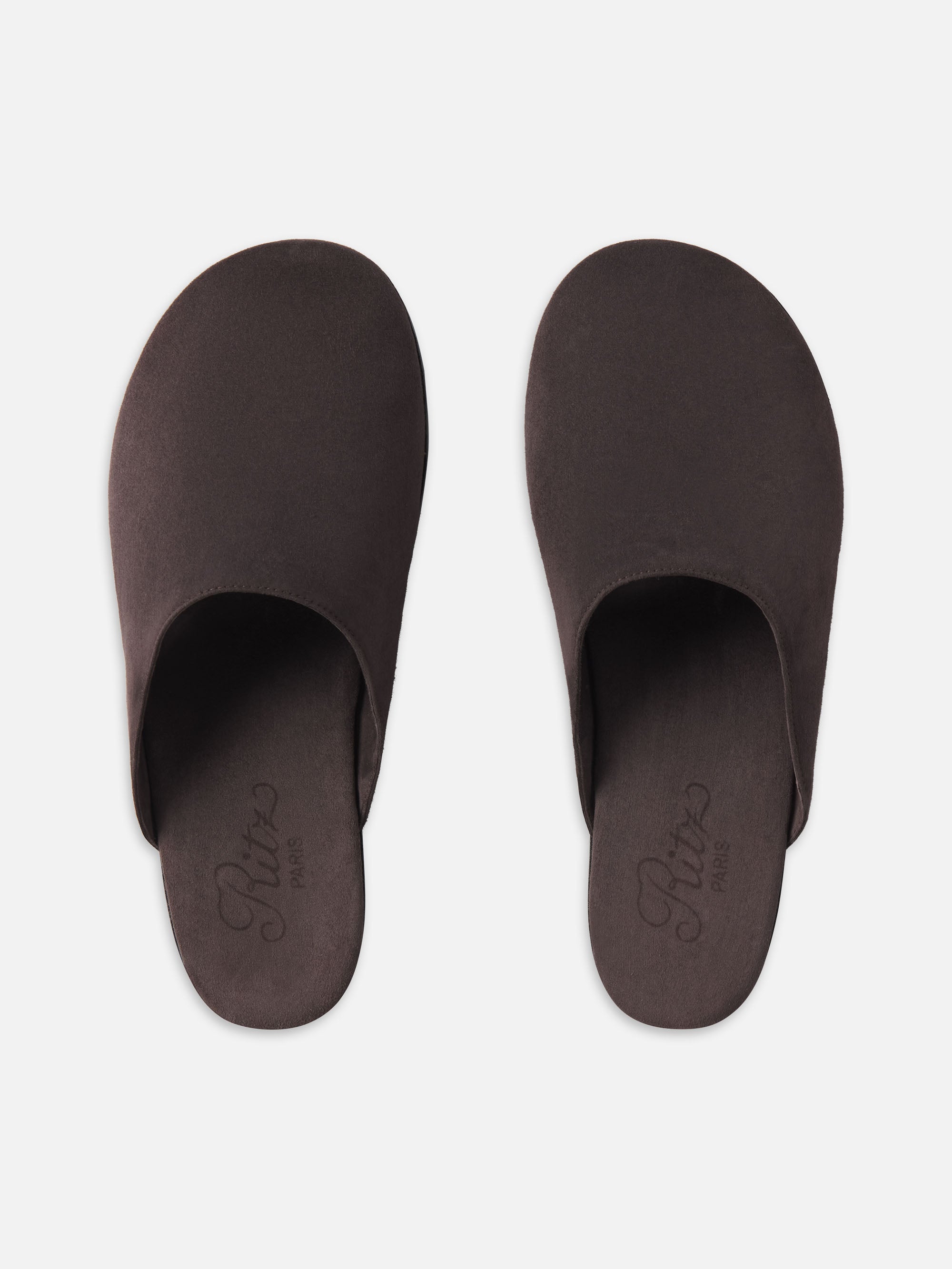 The FRAME x Ritz Paris mules are crafted in 100% suede in a rich dark brown hue. A comfort-first essential designed to bring the ease of the Ritz home.