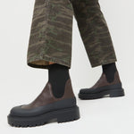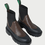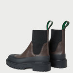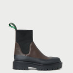Weather boot in brown pebble leather. Features a rubber outsole, almond toe, and stretch gore ankle. Pulls on. 0.5-inch heel.