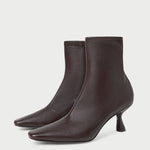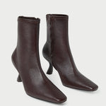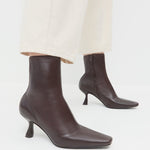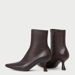Heeled ankle boot in brown crinkle patent stretch leather. Features a curved heel, an elongated pointed toe, and a concealed zipper closure. 2.75-inch heel.