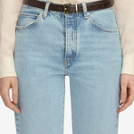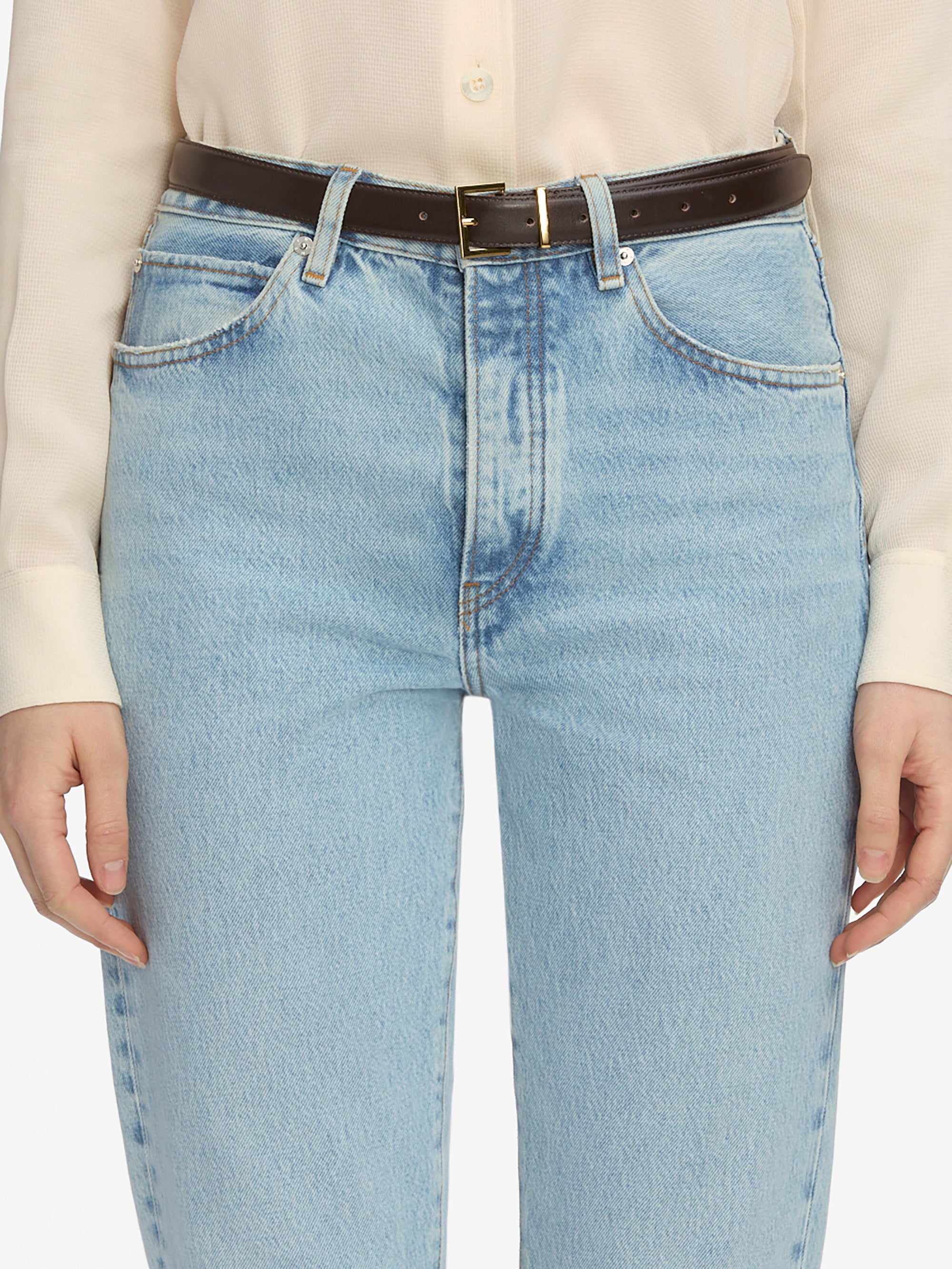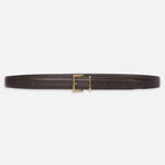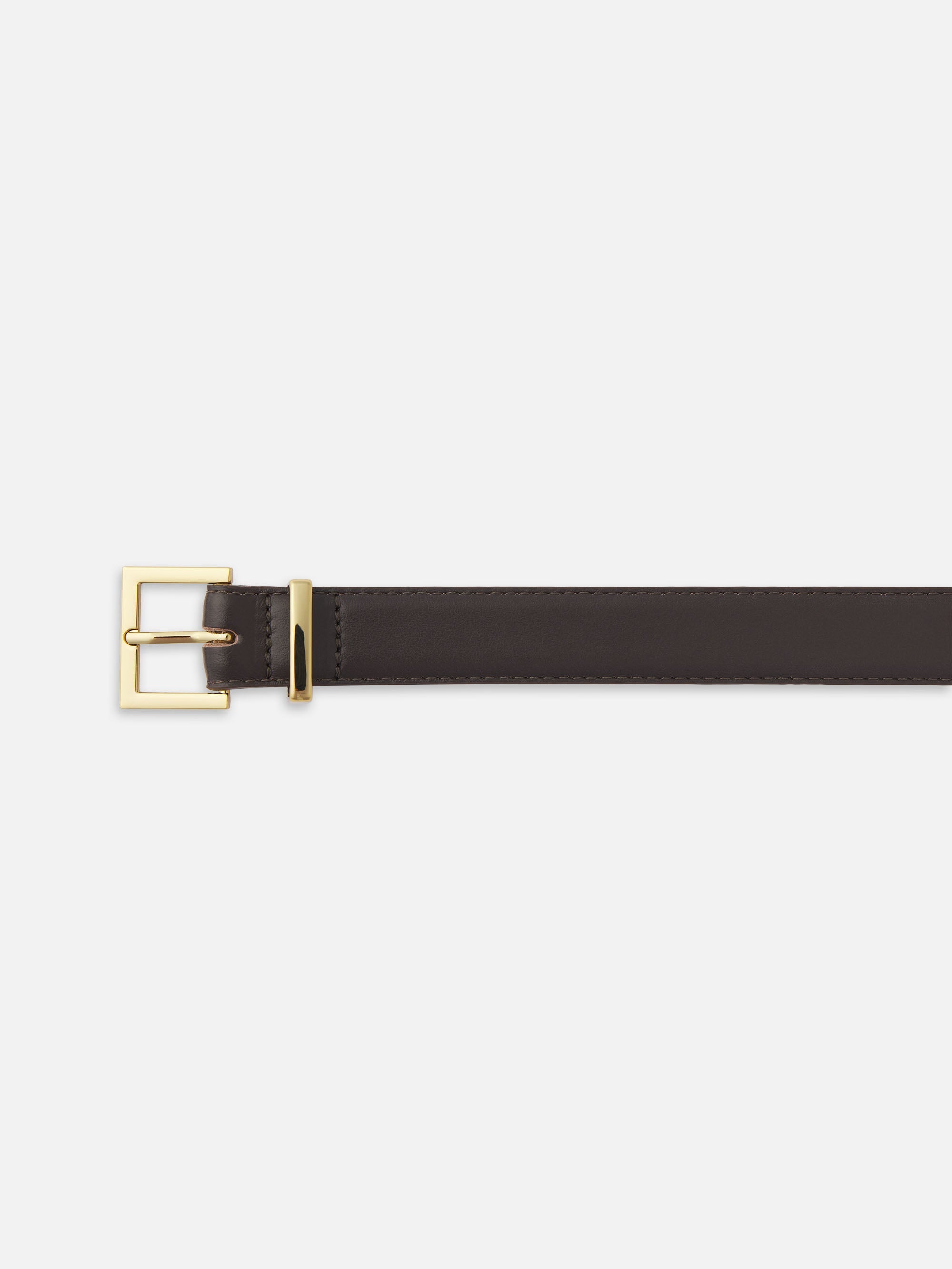 Crafted from dark brown leather with a squared gold buckle, this belt adds a refined finish to denim, trousers, or crisp shirting. It's the foundational piece with clean edges and a soft, smooth feel.