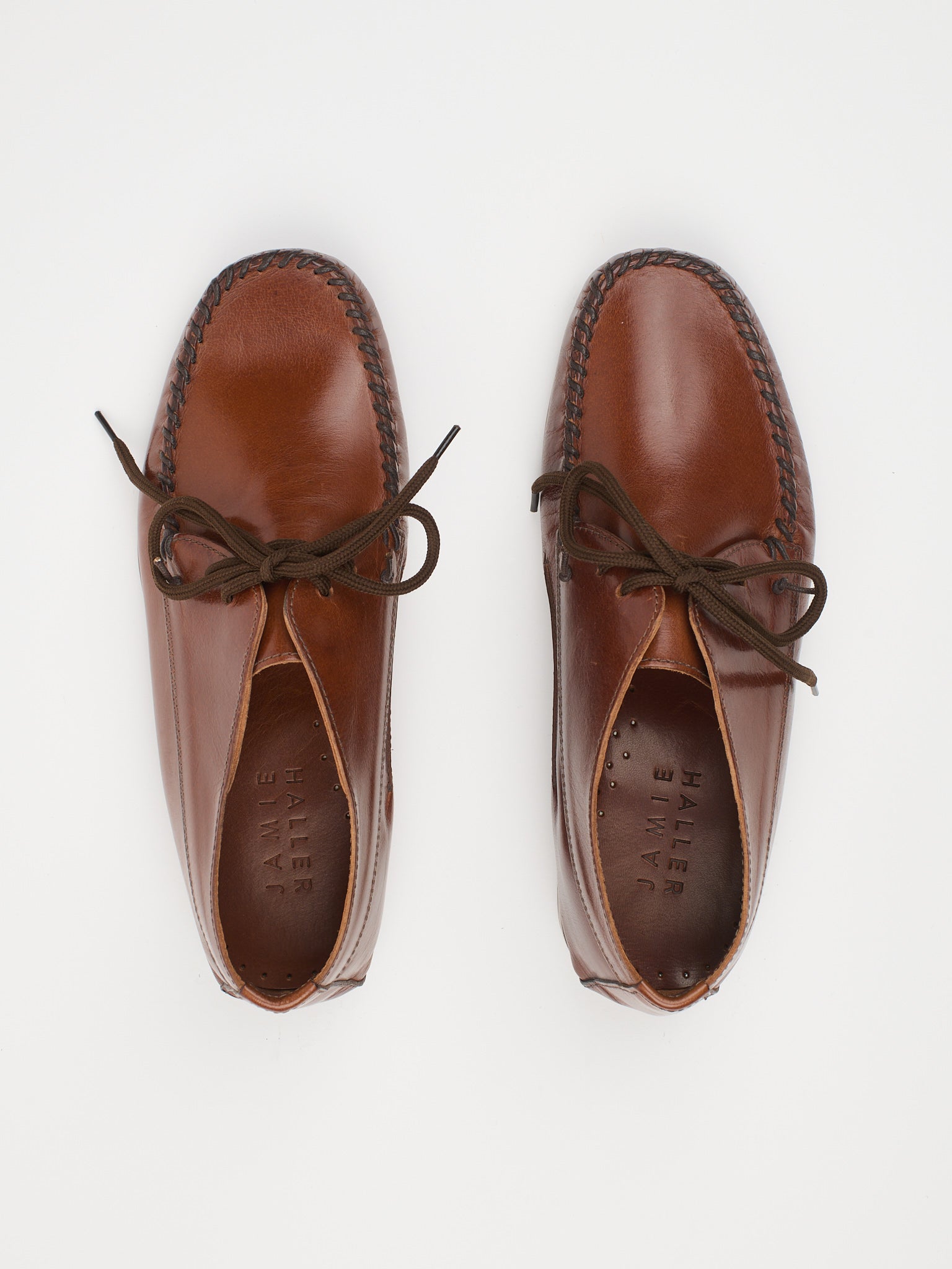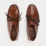 A moccasin constructed bootie, with references including those of a loafer, a chukka and a moccasin. Handmade in Italy using Italian Buffalo. Constructed with an oiled leather sole and sturdy leather heel. Handmade in Tuscany, in an old world family factory.
