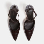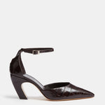 Victoria Pump, handcrafted in coco brown croc embossed leather with a closed pointed toe, ankle strap with buckle fastening and a cushioned calf leather insole. 80mm heel. Made in Italy.