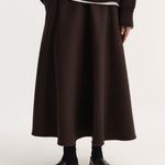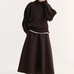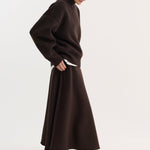 An exceptional voluminous A-line silhouette skirt, crafted from a recycled wool blend with a textured surface, it offers a soft touch. Style it with our dark brown V-neck jumper for a statement tonal look. This piece is part of our commitment to a more concious approach.