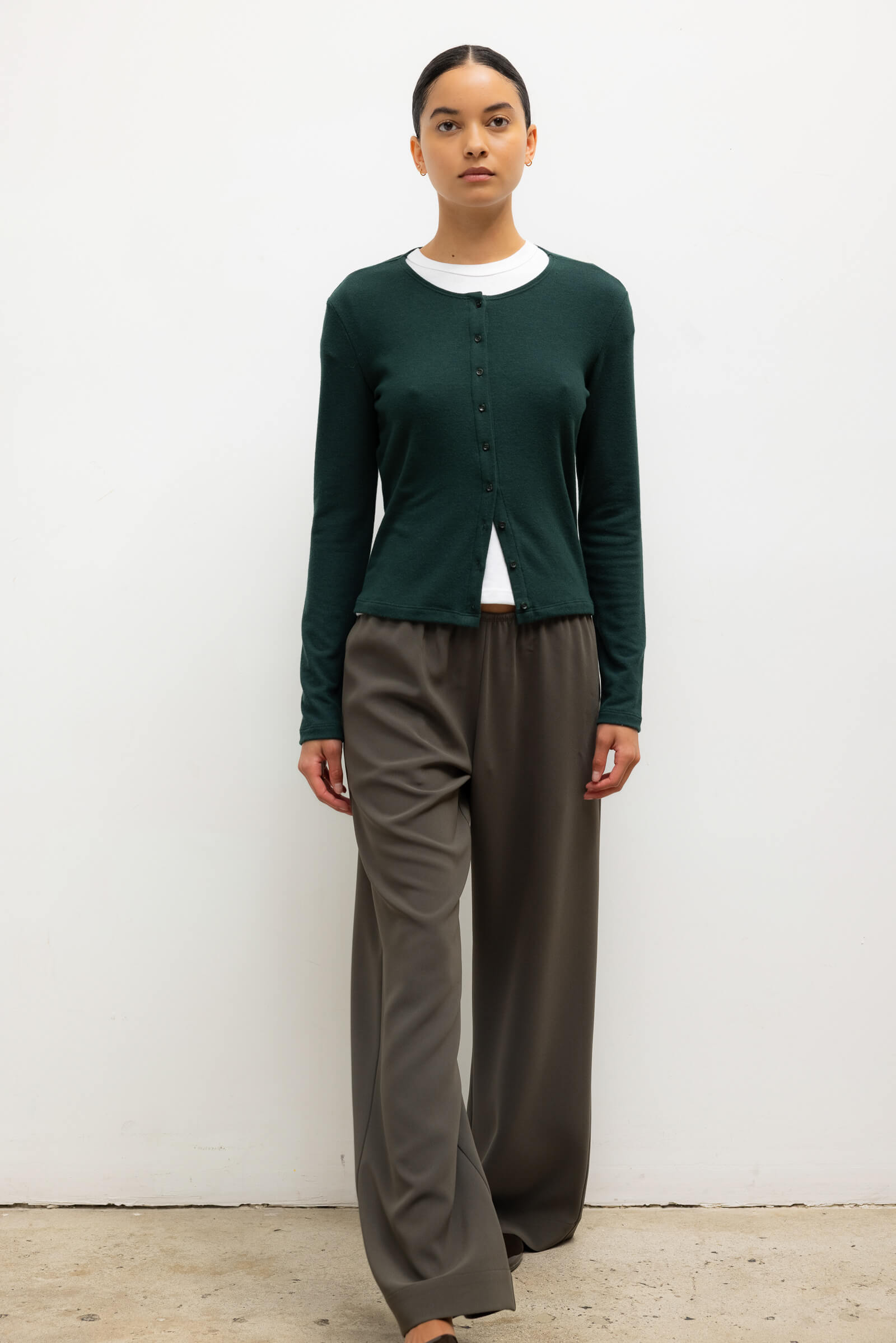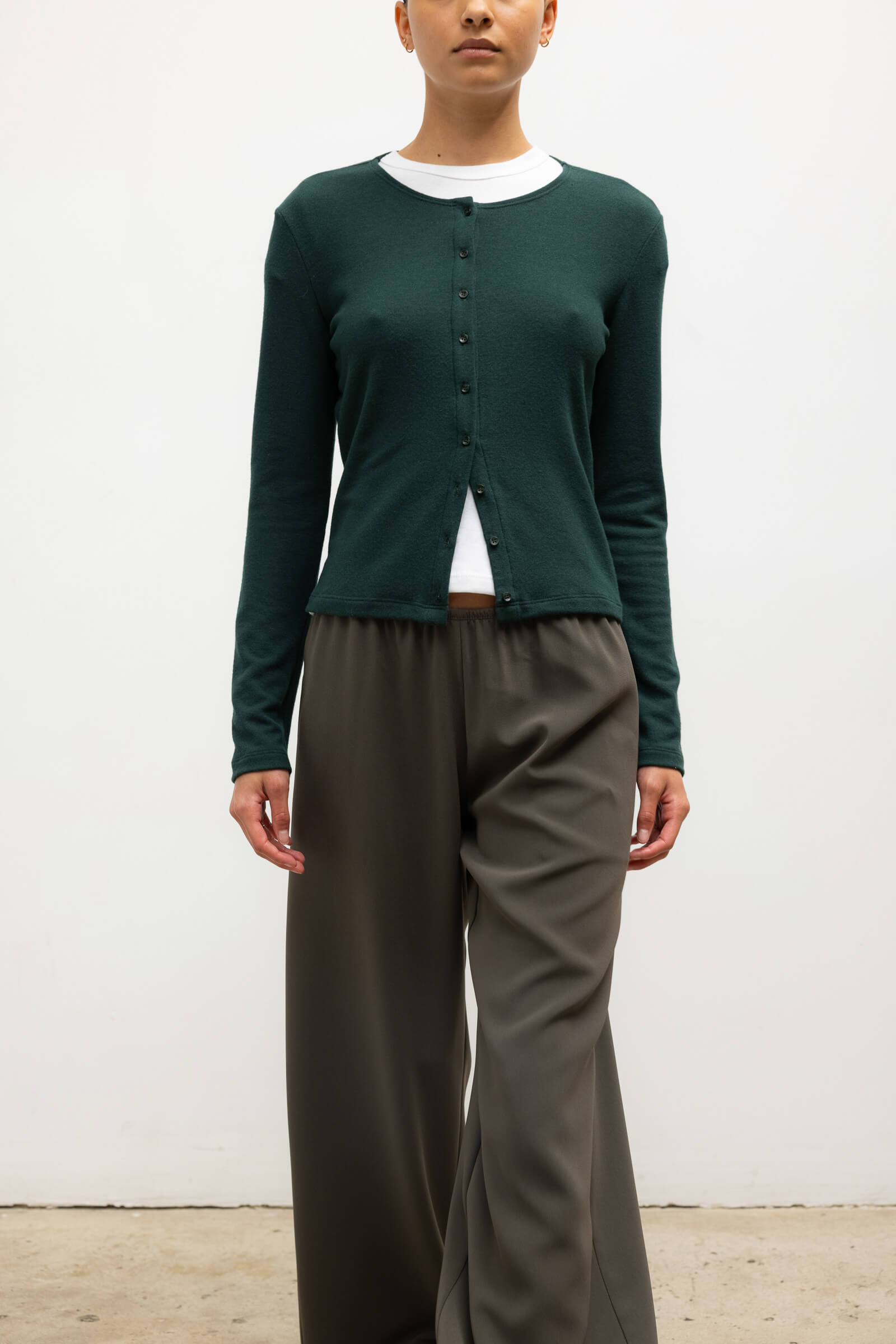 Cut in our buttery soft brushed sweater jersey, The Lauren Classic Cardigan is the full length sister to our bestselling Lauren Crop Cardigan II. This wardrobe staple features a tonal button front closure and fitted long sleeves.