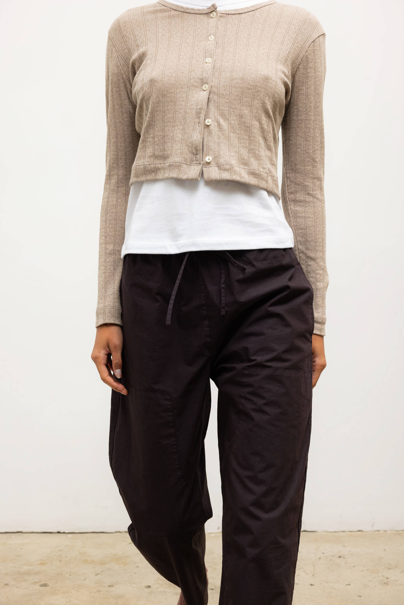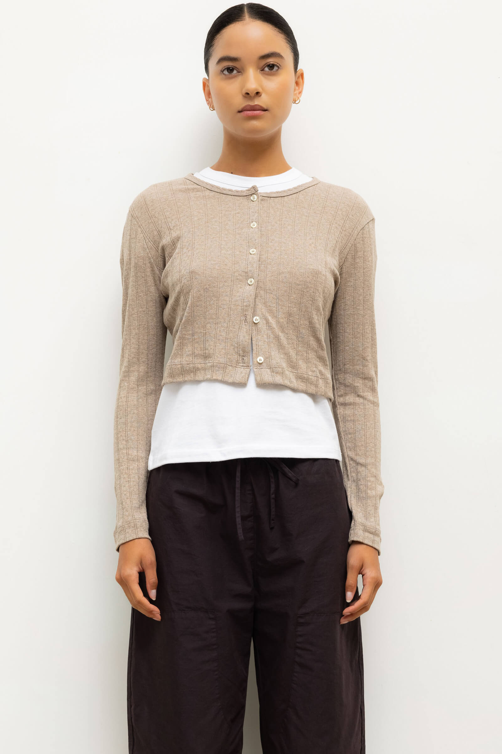 Cut in our nostalgic Pointelle Cotton, The Pointelle Crop Cardigan is the cropped length sister to our bestselling Pointelle Classic Cardigan. Featuring signature pinhole stripes, dainty eyelets, and scalloped edging. Wear it buttoned up as a top or over any matching Pointelle top.