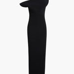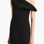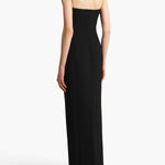 A dynamic, sculptural interpretation of the strapless dress in double-faced crepe that accentuates clean lines. Draped bodice with handkerchief detail and concealed power mesh boning. Concealed zipper at slit back.