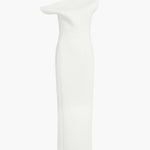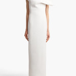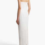A dynamic, sculptural interpretation of the strapless dress in double-faced crepe that accentuates clean lines. Draped bodice with handkerchief detail and concealed power mesh boning. Concealed zipper at slit back.