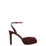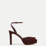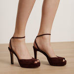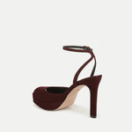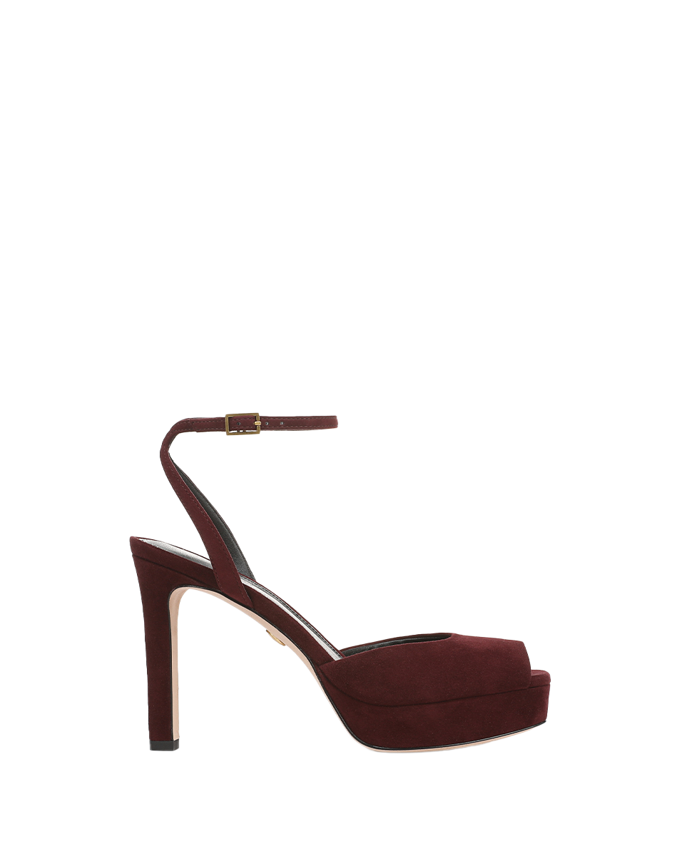 A sleek take on the platform sandal. Crafted from premium burgundy suede, the Brianne features a towering four-inch stiletto heel, offset by a chunky platform sole. A wraparound ankle strap with a buckle closure completes the look. Pair these heels with wide-leg denim for daytime or a flowing maxi dress for evening.