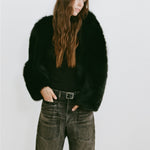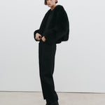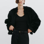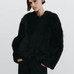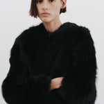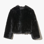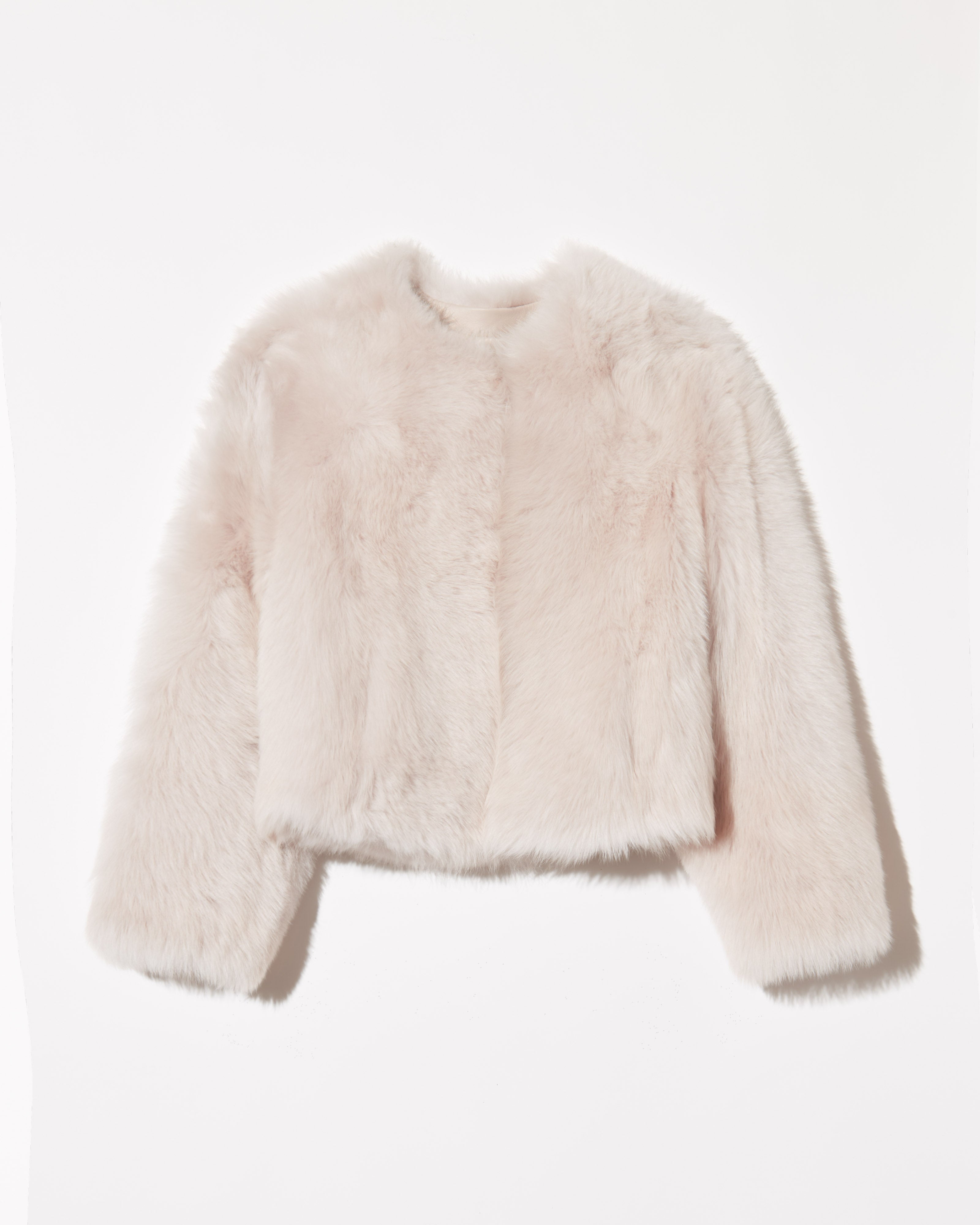 Short-body shearling jacket. Collarless design with relaxed shoulders. Side seam pockets. Fur hook closure. Fully lined with leather facing.