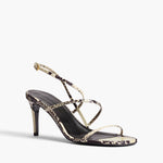 A heeled sandal of lyrical lines, wrapping the foot in ribbon-like bands of leather that fasten at the ankle with a gold-toned buckle. Leather sole.