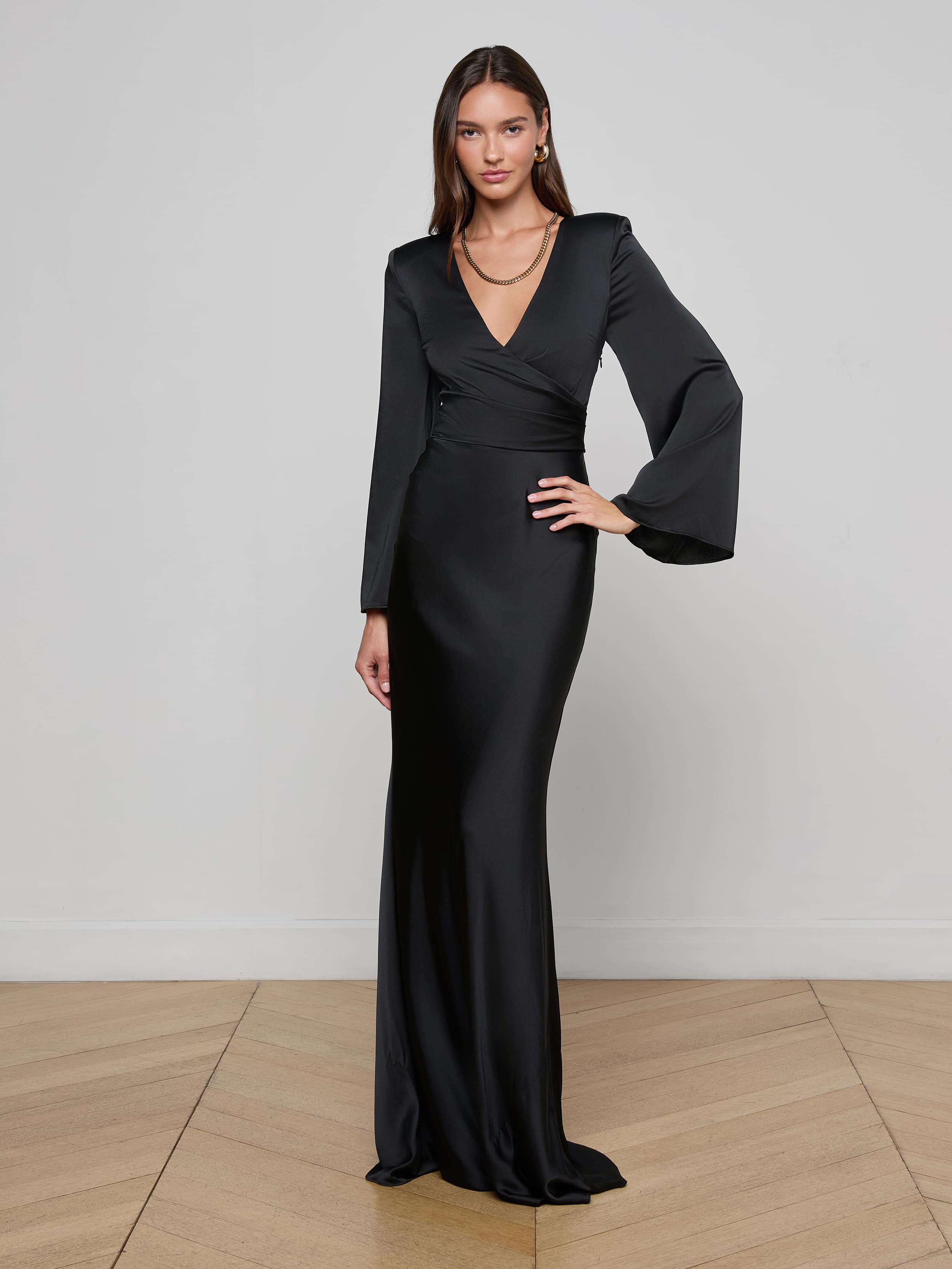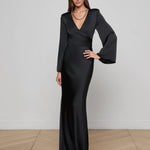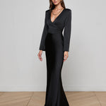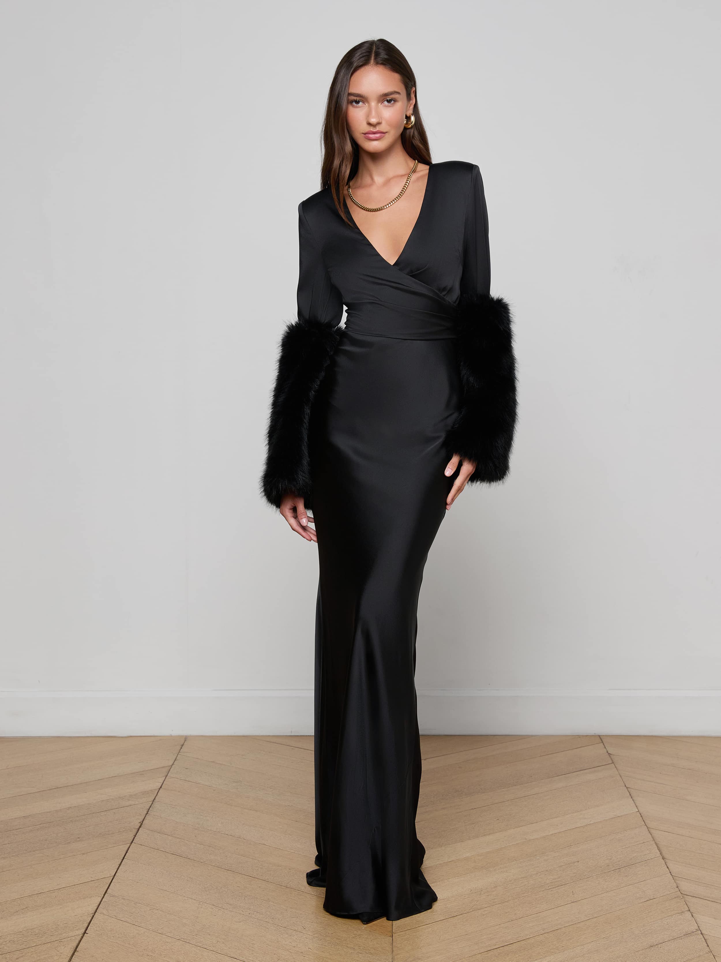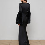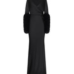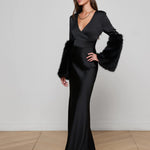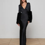 The Manon gown commands attention with unapologetic glamour. Cut from lustrous satin, the gown features a plunging wrap neckline and a floor-sweeping silhouette. Dramatic faux fur cuffs add high-impact texture and a sense of drama, making this piece the definition of elevated opulence.