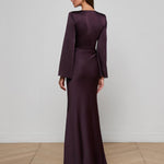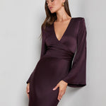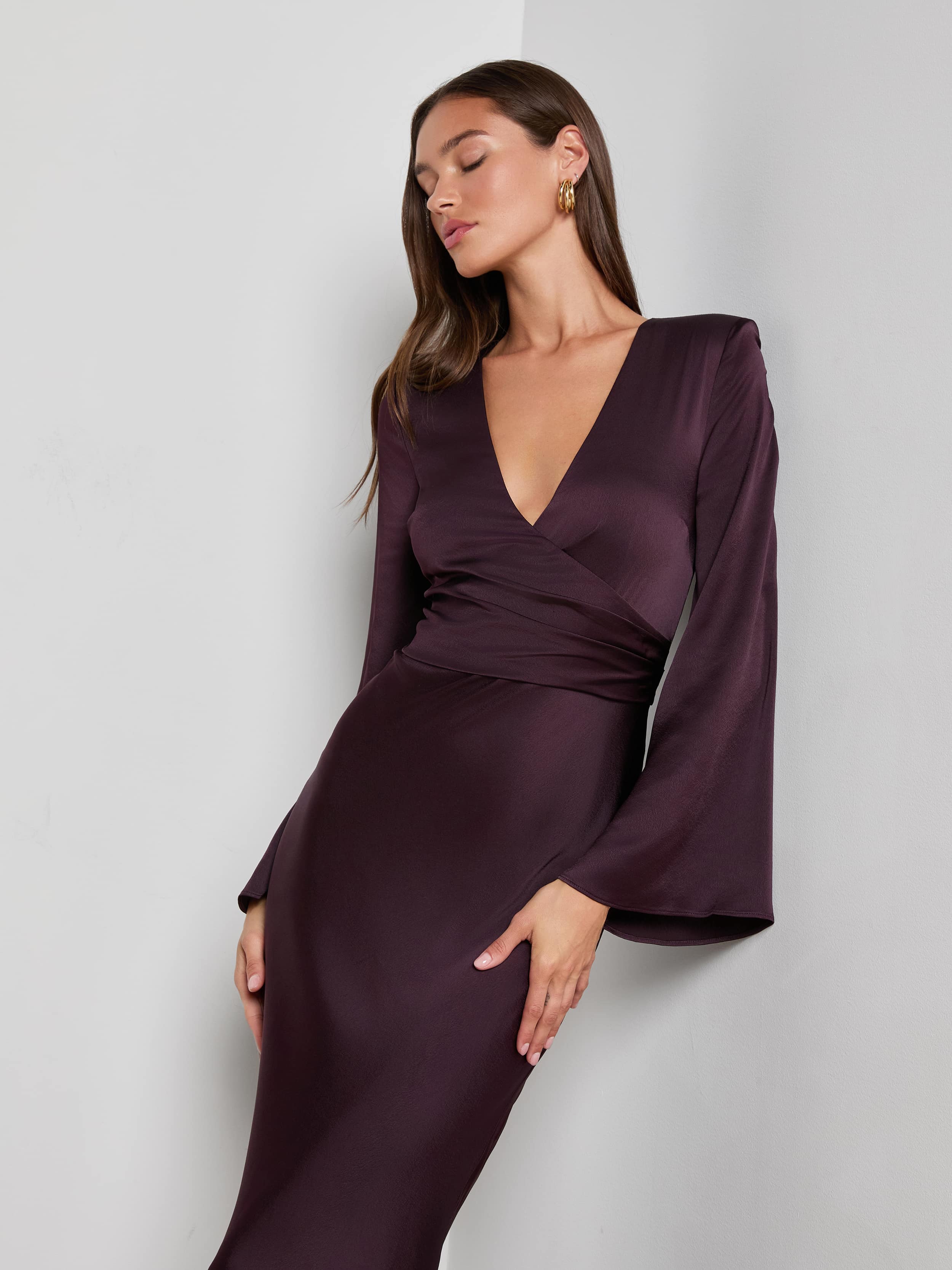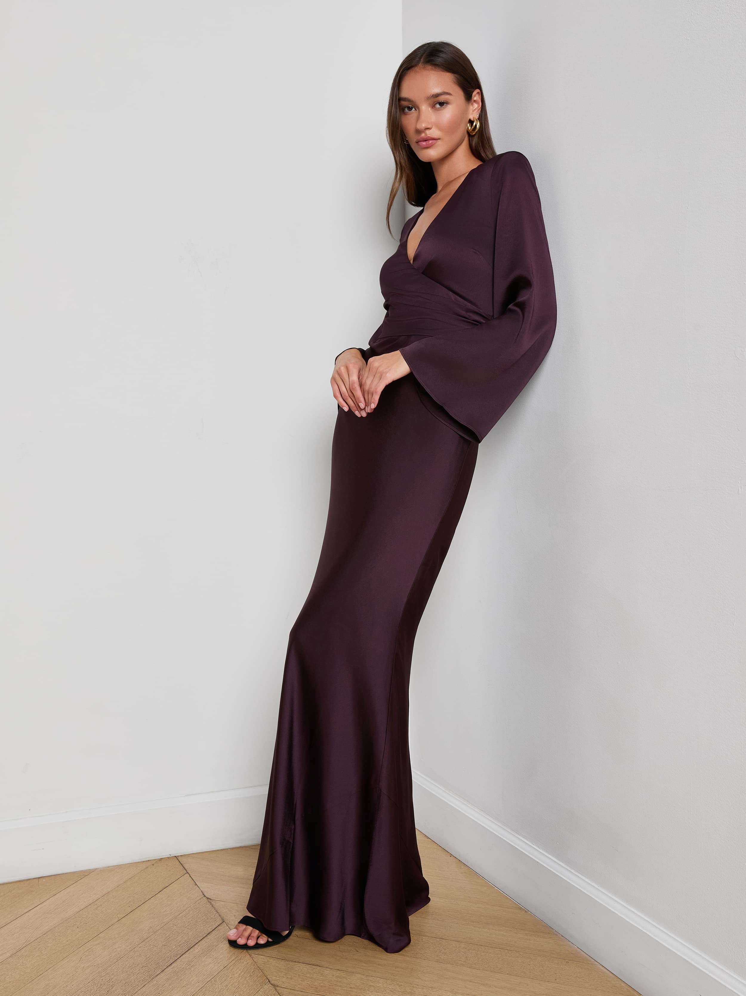 The Manon gown commands attention with unapologetic glamour. Cut from lustrous satin, the gown features a plunging wrap neckline and a floor-sweeping silhouette, now in dark malbec.