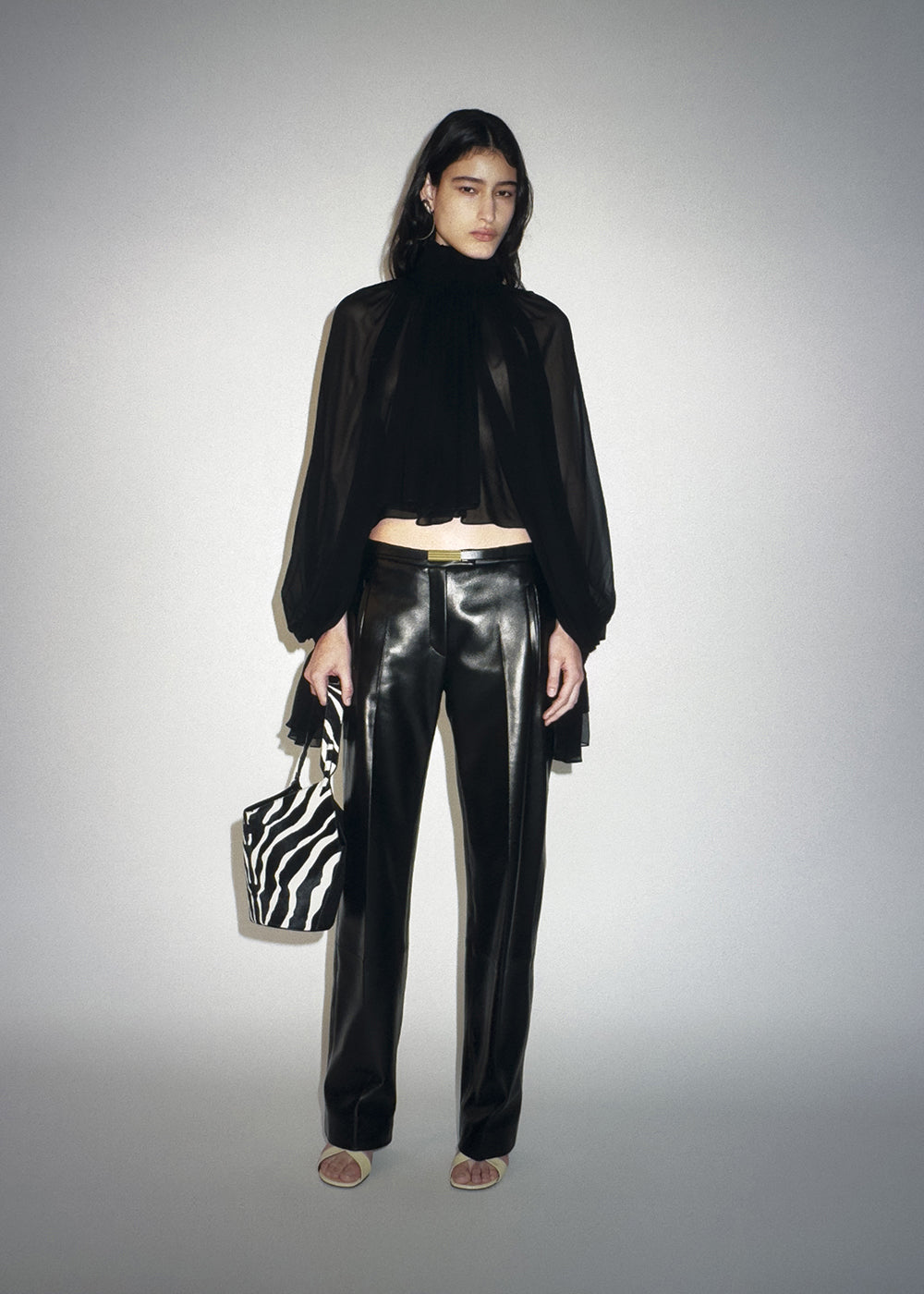 Fusing ‘90s grunge with a bohemian spirit, this fluidly formed shirt is framed by a high stand collar for a regal bearing. Cutaway silhouette animated by hand-crushed cartridge pleating, with billowing sleeves cinched at the wrist. Wear with slit neckline at front or back.