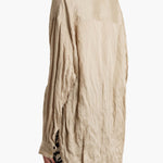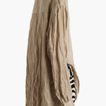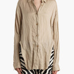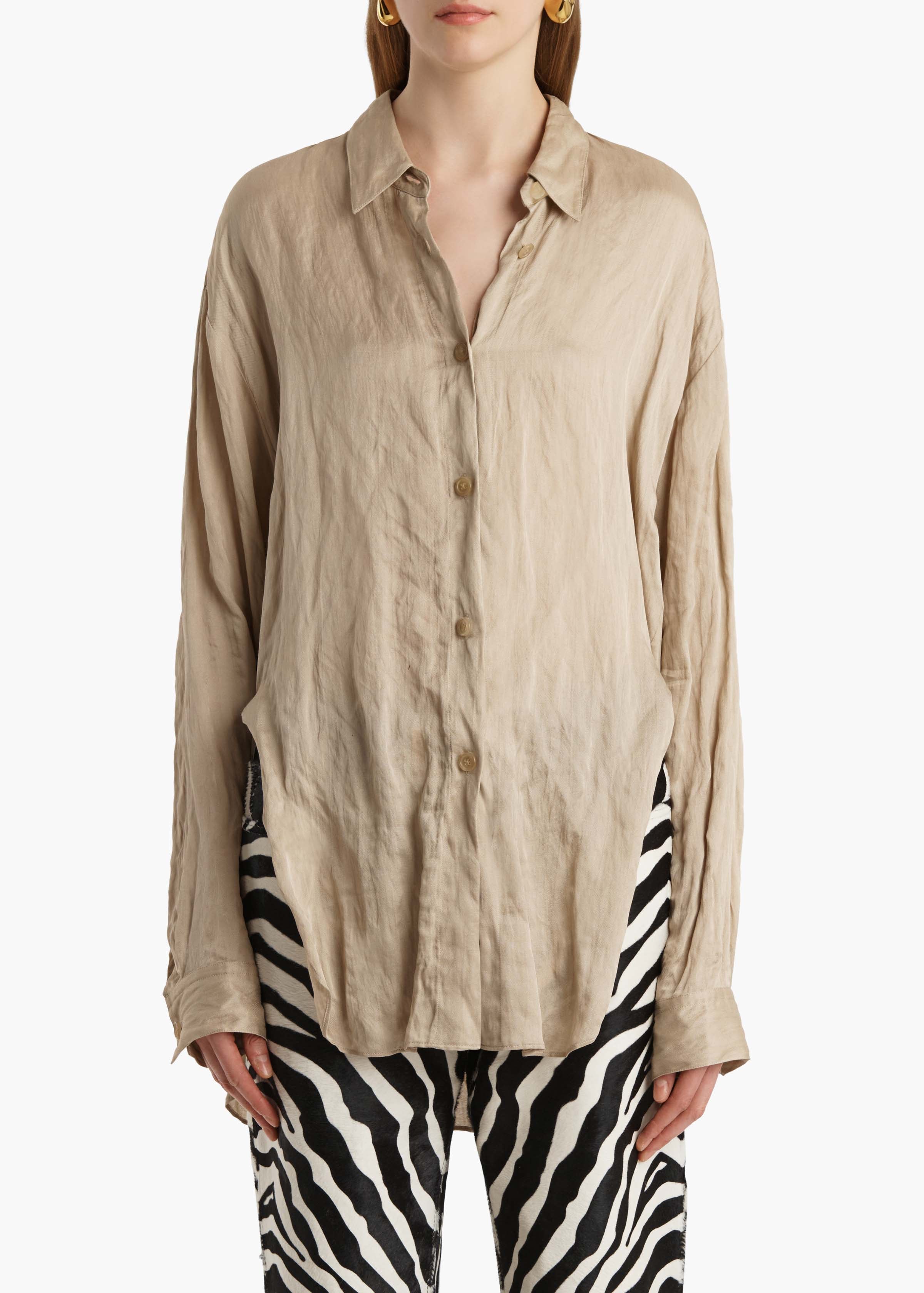 A relaxed button-up that looks to the cutaway collar of men’s shirting. Seamed at the sides to accentuate the rounded shape, which dips lower in back. Dropped shoulder seams, back yoke, and single button cuffs.