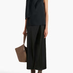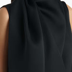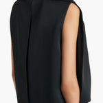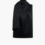 A fluid yet refined top in bonded crepe satin selected for its dense, sculptural sheen. Draped stand collar formed by scarf detail that wraps to swing over the shoulder. Slips on, with button closure at back neckline.