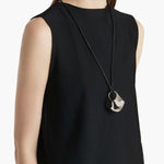 Inspired by the scarf-inspired signature form of the Lotus tote, this sculptural pendant is made of brass plated in polished palladium. Its lightness is achieved through laminar construction and precision milling rather than a conventional mold. Suspended on a black leather cord tipped with intrecciato mignon accents and custom aglets. Wear as a necklace or as a belt.