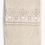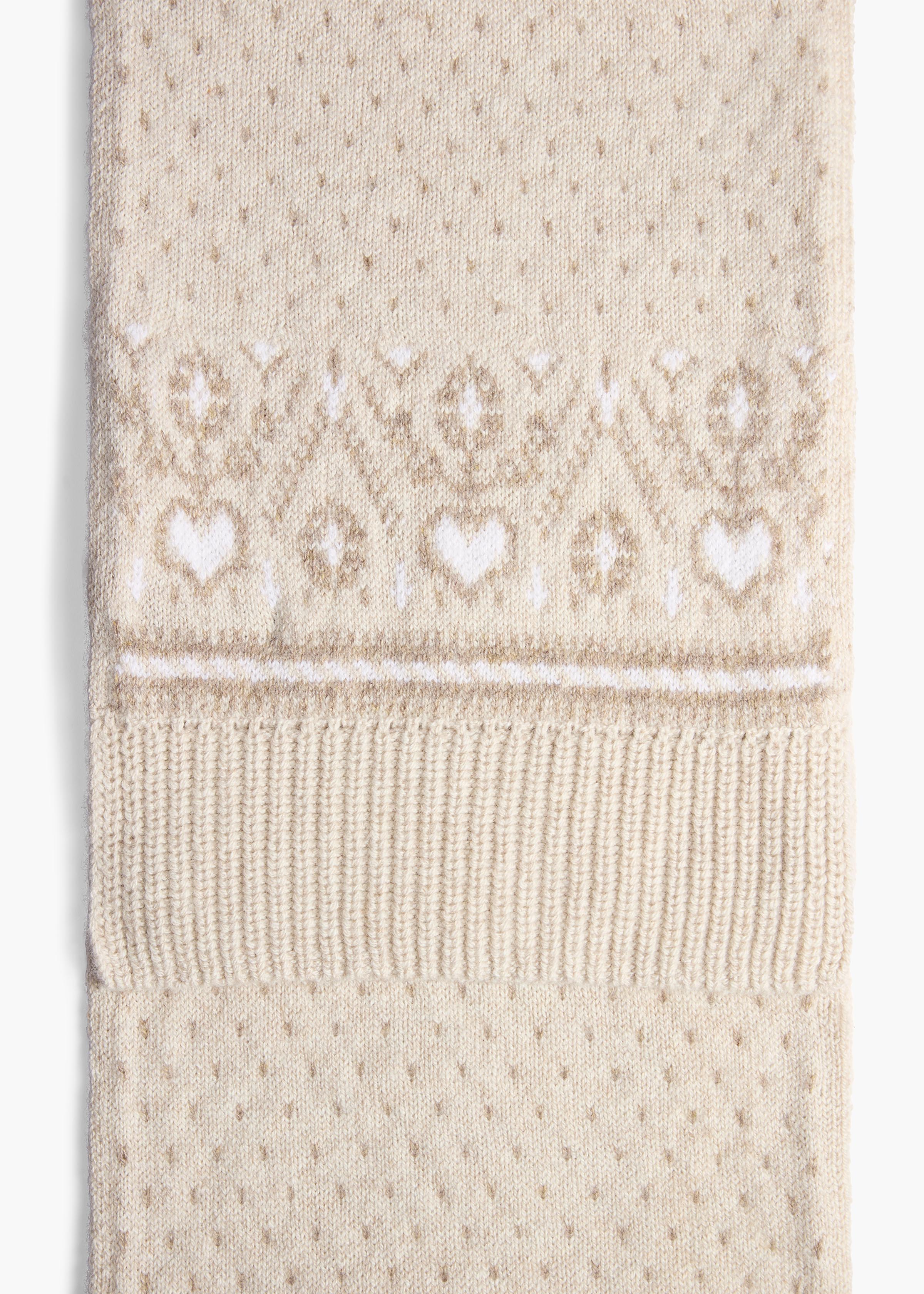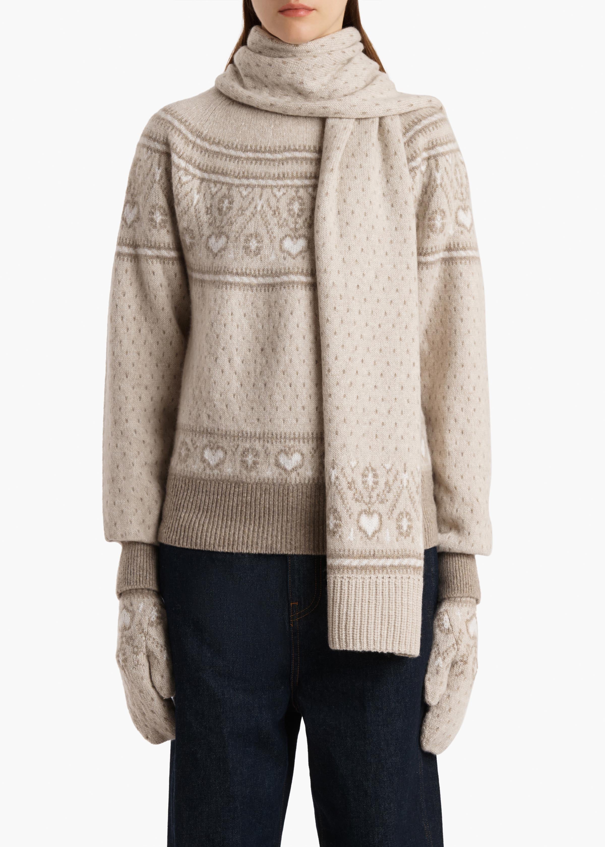 A luscious scarf of lofty cashmere. The Fair Isle pattern, integrating hearts and stylized flowers, is softened by neutral hues. Fringed edges.