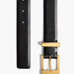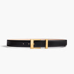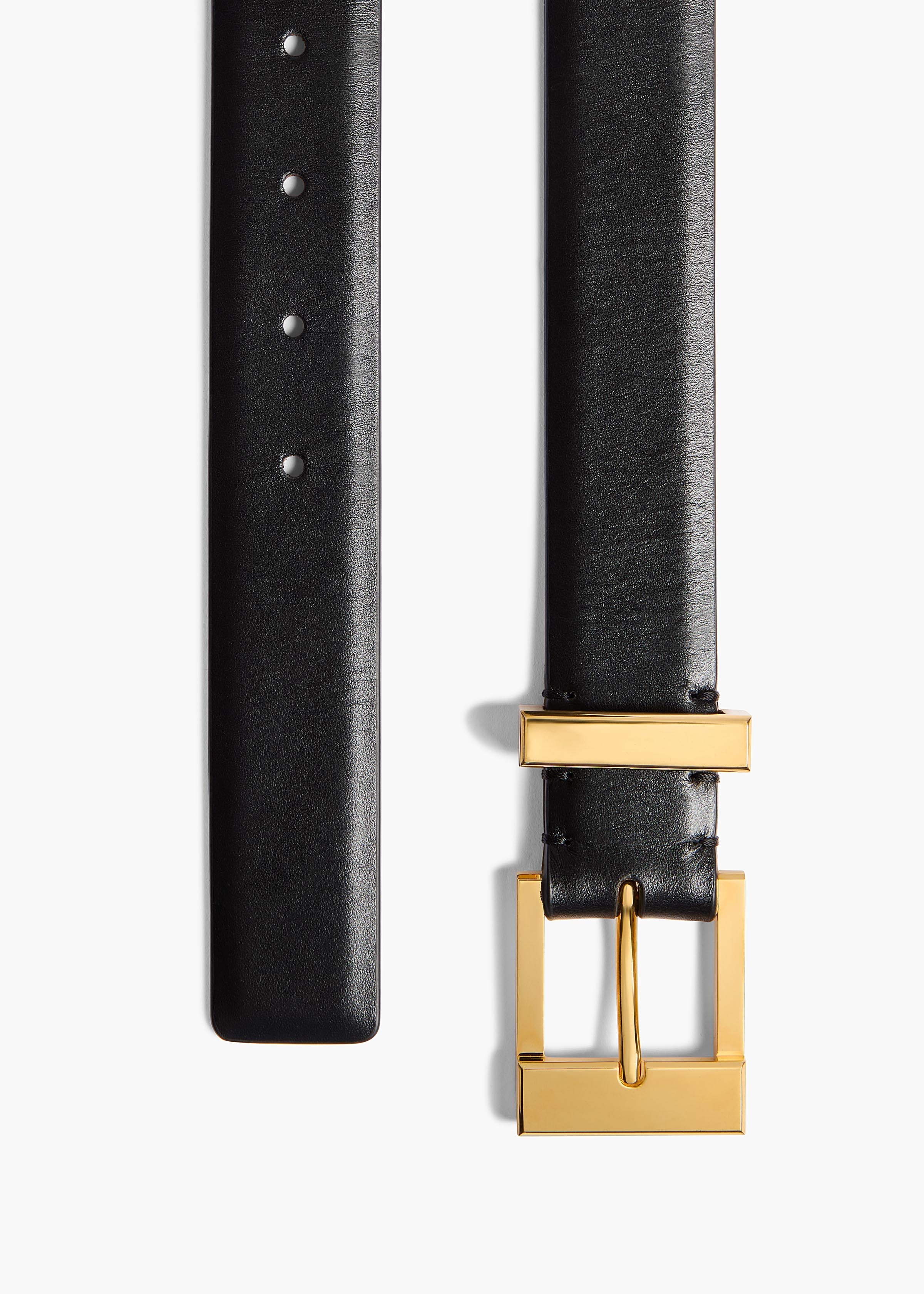 Scaled up to a versatile width of 1.18 inch (30 mm), this sleek calfskin belt is crafted in Italy to feature jewelry-grade hardware—a squared buckle and loop—in 18-karat-gold-plated brass that is polished to a fine gleam.