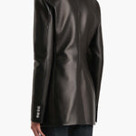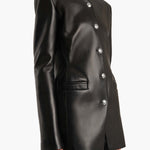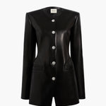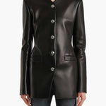 A collarless, high-necked jacket shaped by sleek lines and decisive details, including reinforced shoulder pads and functional welt pockets. Single-breasted silhouette designed to fit long and lean. Lined in cupro twill.