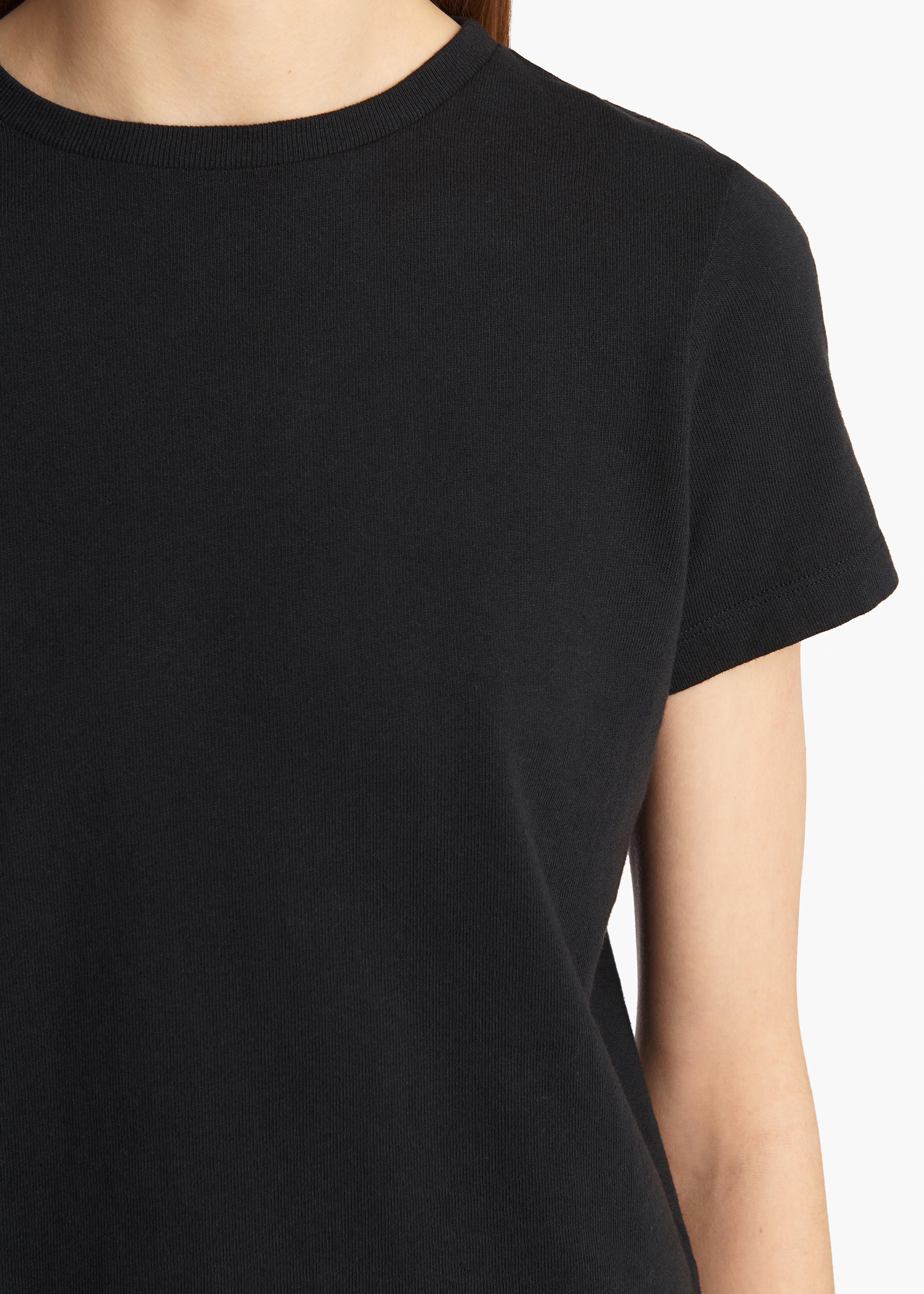 A crewneck tee that combines clean lines with sporty ease. Designed for a slightly shrunken fit. Finished neckline. Intarsia-knit applique at back.