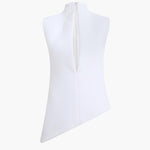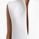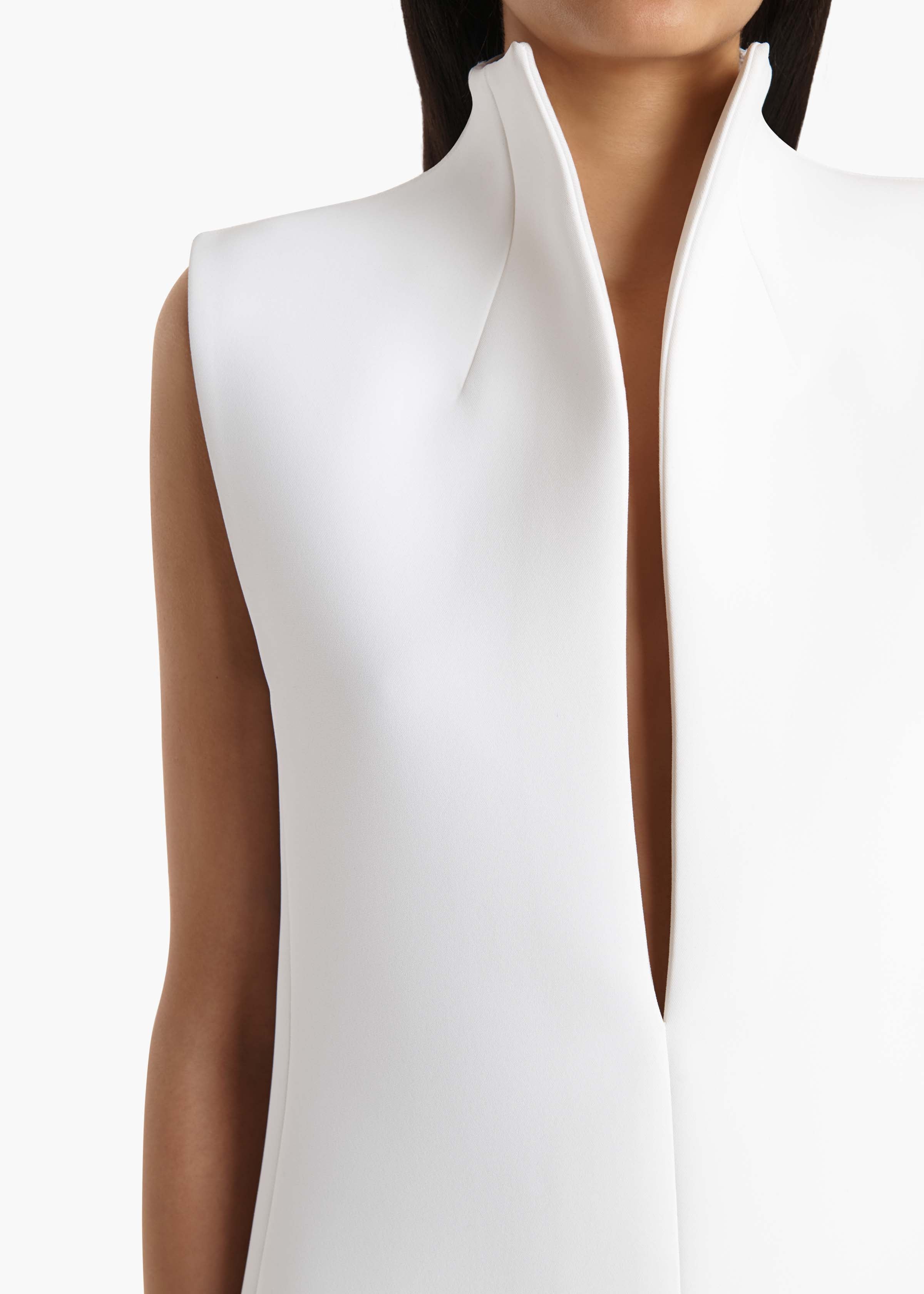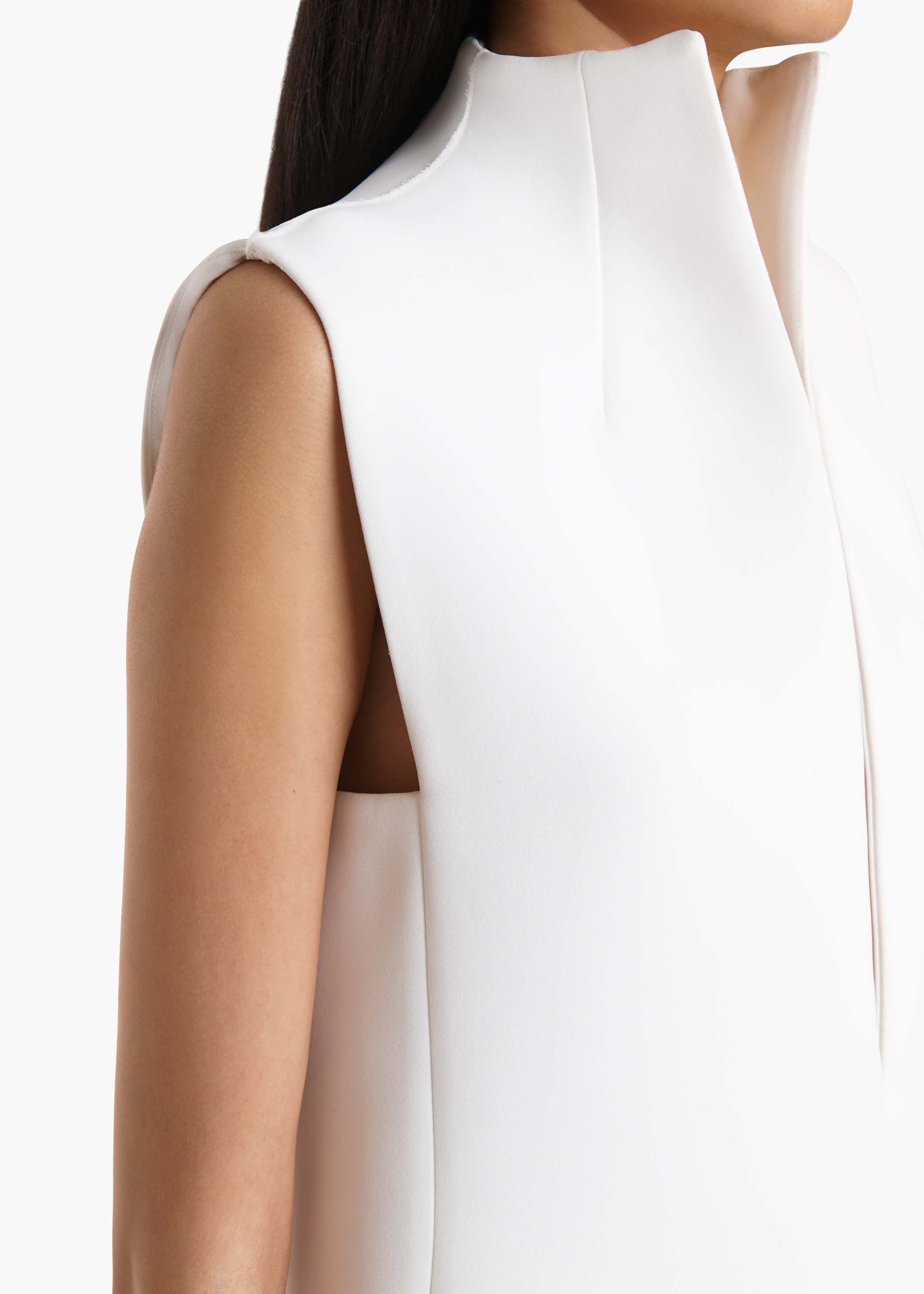 A sleek silhouette make striking by decisive lines and assured angles. Framed by darted stand collar and deeply slit neckline. Concealed zipper closure at back. Discreet hook-and-eye closure at center front.
