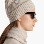 A luscious hat of lofty cashmere. The Fair Isle pattern, integrating hearts and stylized flowers, is softened by neutral hues. Tonal ribbed trim.