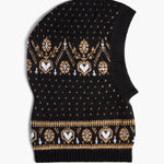A balaclava that envelops the head and neck in luscious, lofty cashmere. The Fair Isle pattern, integrating hearts and stylized flowers, is softened by neutral hues.