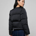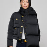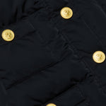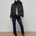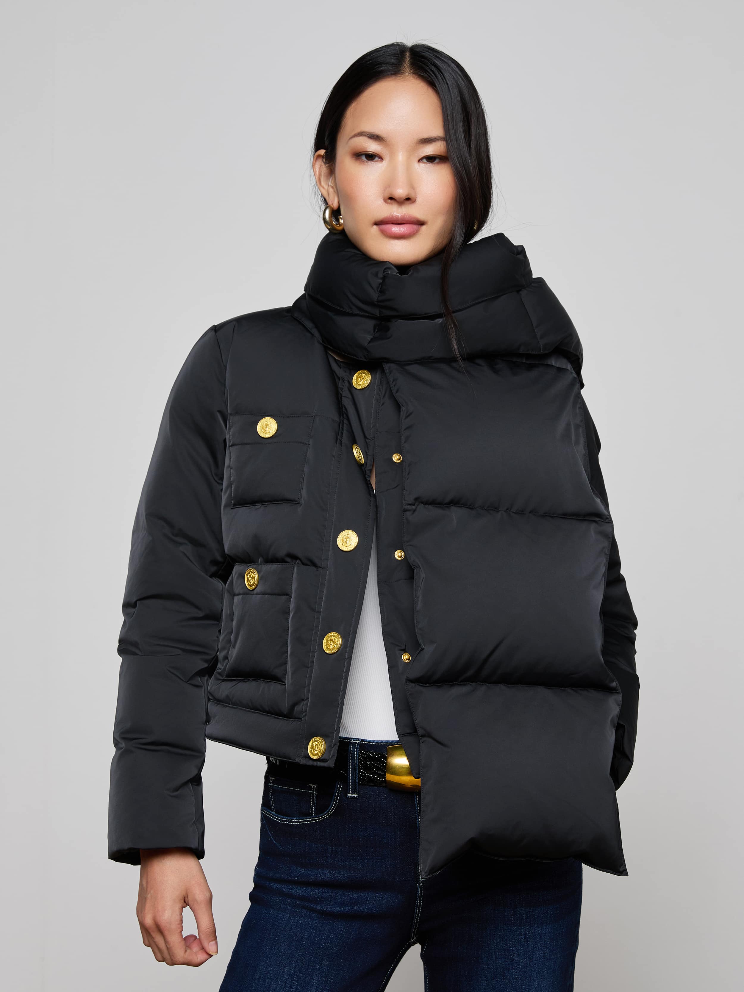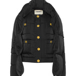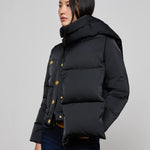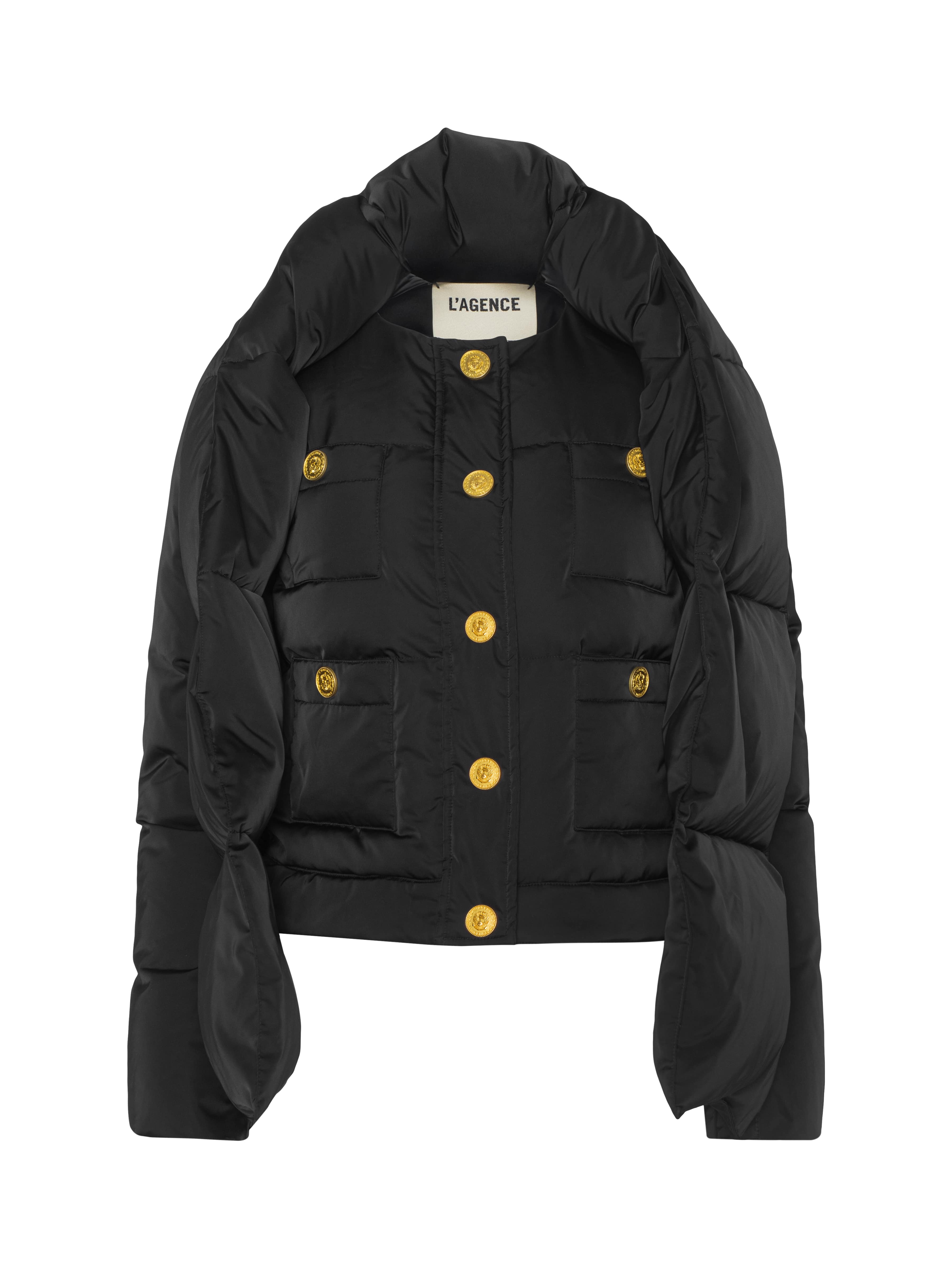The Juana jacket is a glamorous take on functional outerwear, complete with a detachable scarf for versatile styling. Punctuated by gleaming gold buttons, its modern cut and feminine silhouette elevate the classic puffer into a luxe statement piece.
